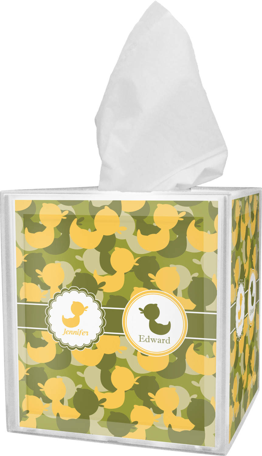 These tissue holders are built from durable acrylic and display your unique personalization on fine-quality vinyl inserts placed within the four sides and top. The box features two pieces, allowing you to easily switch out tissue boxes. On the sides, youll find ridges that ensure the top and base fit securely in place. The bottom of these tissue box holders has four, rubber, non-slip pads to prevent the box from scuffing any surface you decide to display it on. Each box can fit a standard 5 by 5-inch box of tissues.