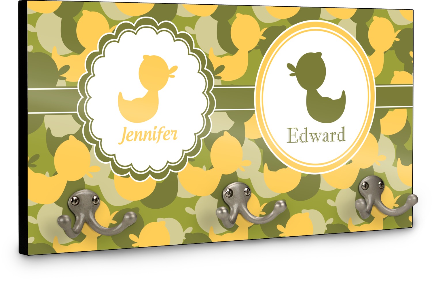 This coat rack is the perfect way to add some personality to your wall or entryway. The board is made of a strong maple that is approximately 16" x 8". The three 2-prong hooks are a sturdy metal that have three screws attaching them to the board. Your design is printed right onto the front of the board while the back and sides are a simple black.