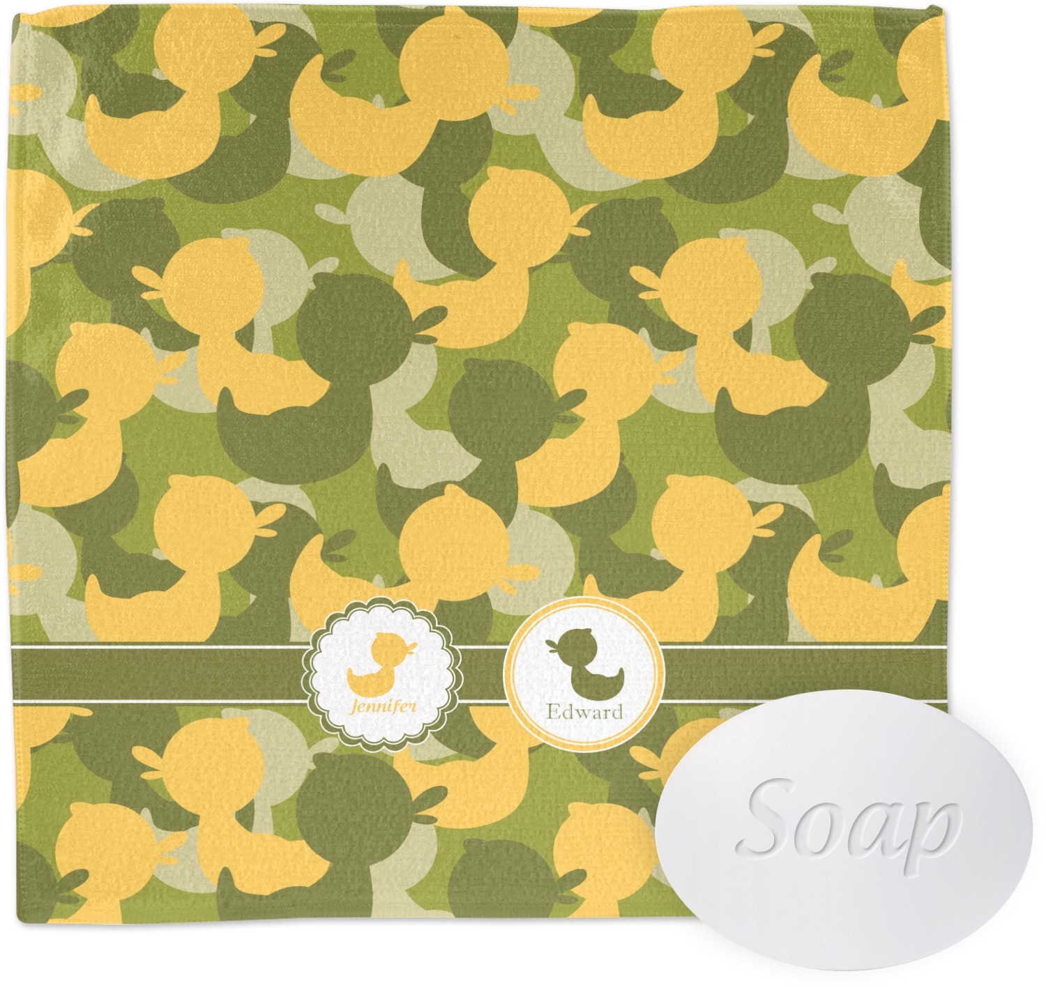 We chose to use a couples / twin personalization on our duck camo design. We used two labels - one is a girl round scalloped, while the second label is a simple round. We used the duck graphics from the camo pattern and used names below the graphics for personalization.