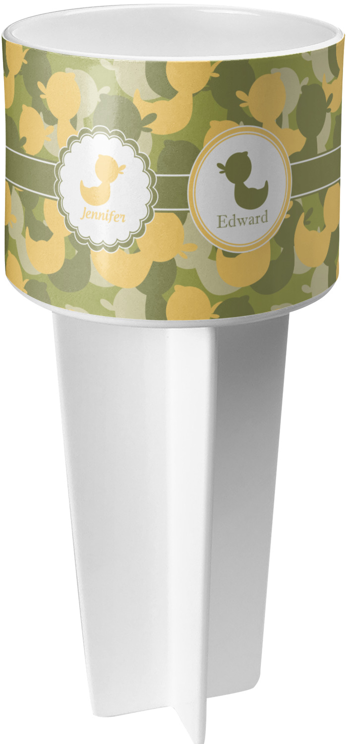 This cup holder has a large stake at its bottom that anchors it to the sand or ground below, while the cup holder rests above the stake. The entire drink holder is made of durable plastic and displays your customization around the cup holder portion. We sell these personalized beach spikers in two different colors: black and white.
