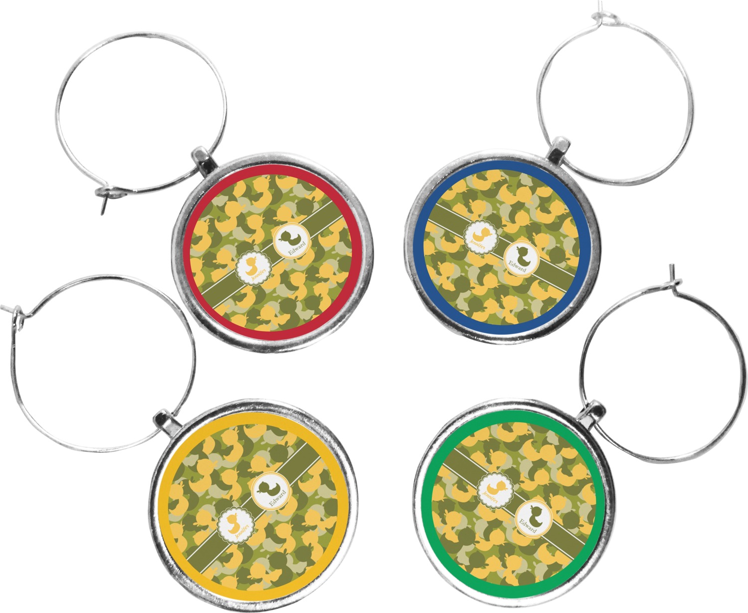 Your wine glass markers are comprised of a circular zinc plate with a 1.25 inch diameter. The zinc plate hangs from a zinc loop, which can be easily secured and removed from the stem of a wine glass. Your customized design is printed onto a 1 inch diameter insert, and then placed into the wine glass charm itself. Though sold in a set of four, you can personalize each charm individually and change the colors of the ring around your design, depending on your needs.
