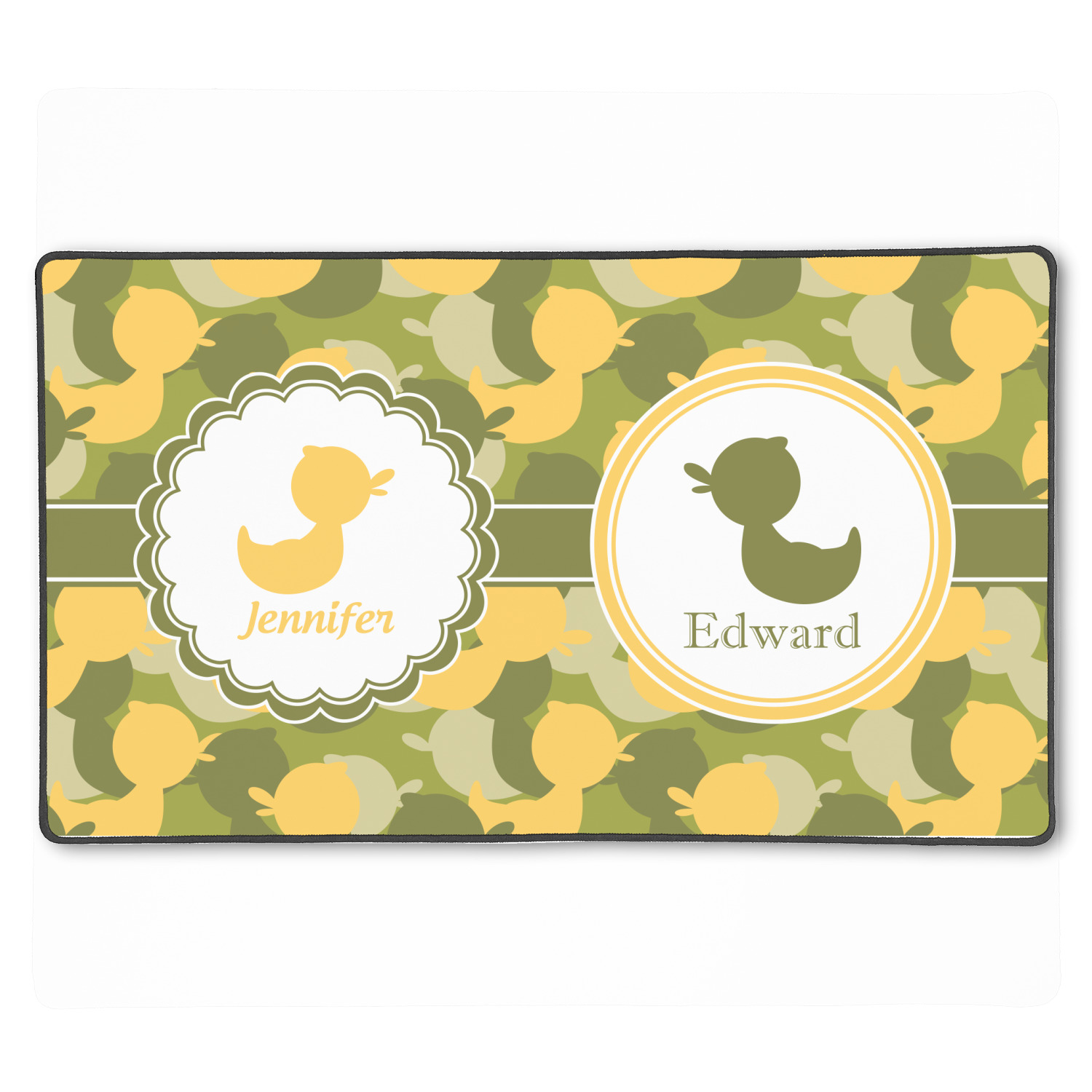 We chose to use a couples / twin personalization on our duck camo design. We used two labels - one is a girl round scalloped, while the second label is a simple round. We used the duck graphics from the camo pattern and used names below the graphics for personalization.