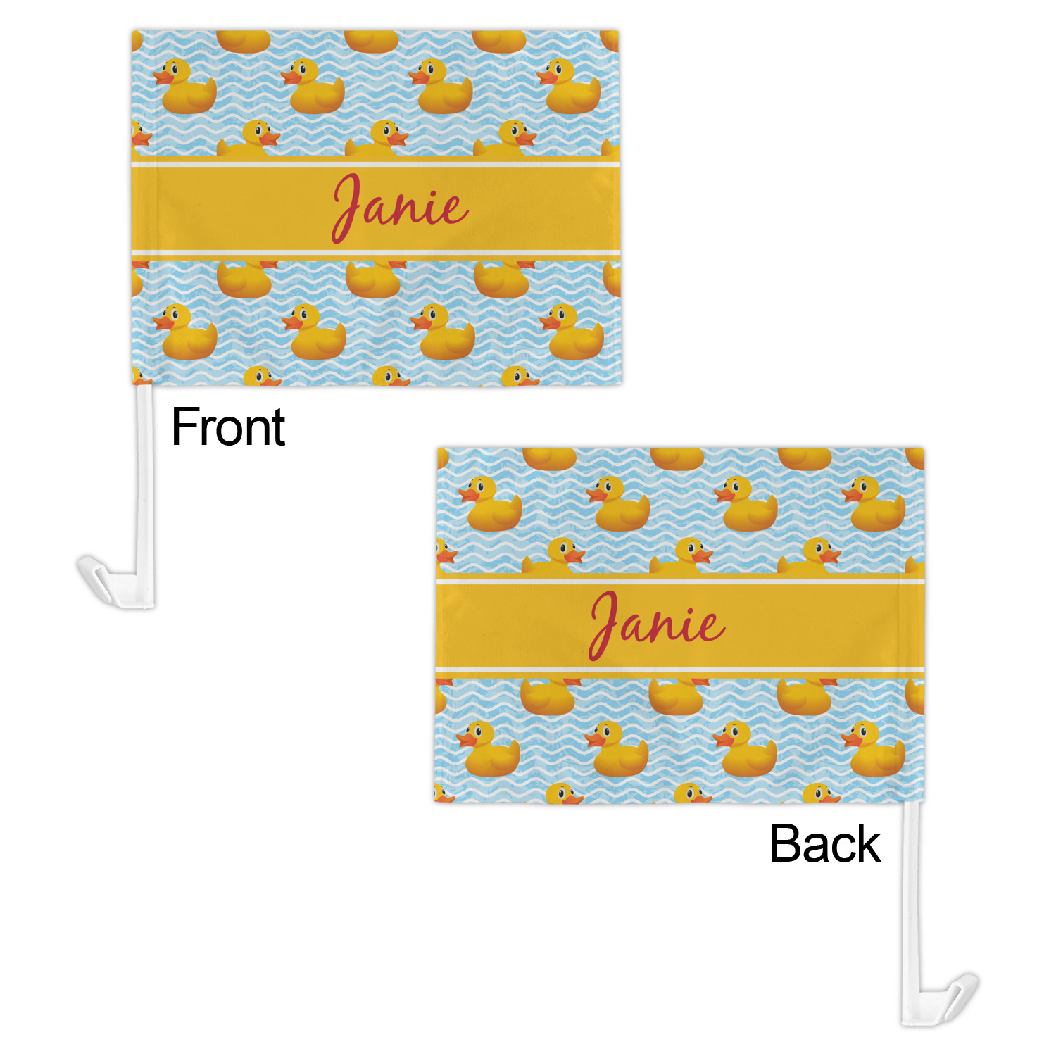 Our personalized flags are made from a durable, yet lightweight cloth that will proudly bear your logo or design of choice, while withstanding the outside elements. We have two size options - 8" x 11" and 11" x 15". Both come with a flag pole which includes a clip that secures the pole to the side window, whether it is rolled up or down. The flags are printed on both sides to display your design from all directions.