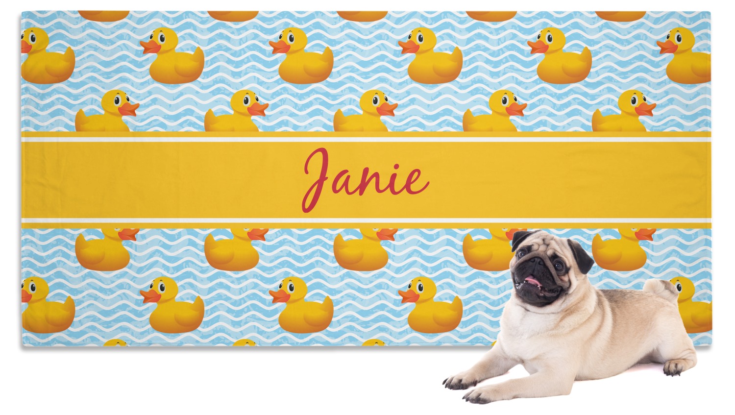 Our custom towels are crafted from a special blend of polyester and polyamide, which contributes to its lightweight, yet thoroughly absorbent nature. We craft it as such to guarantee efficiency as a convenient product; its lightweight nature makes it easy to roll up and carry along, yet it is still able to dry off even the wettest, muddiest pet. It measures at 60" x 30" and is sizable enough to dry off even the largest of pets. With our towel's gentle, soft-to-the-touch material, your pet will be sure to anticipate its warm, dry embrace. We print your personalized design on the front of the towel, while the back is white.