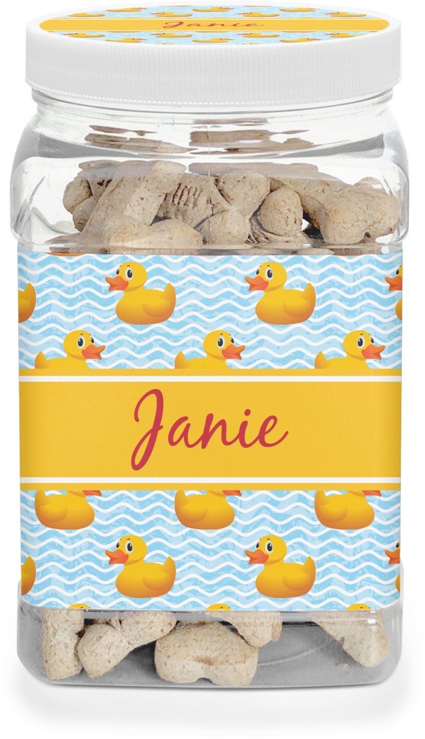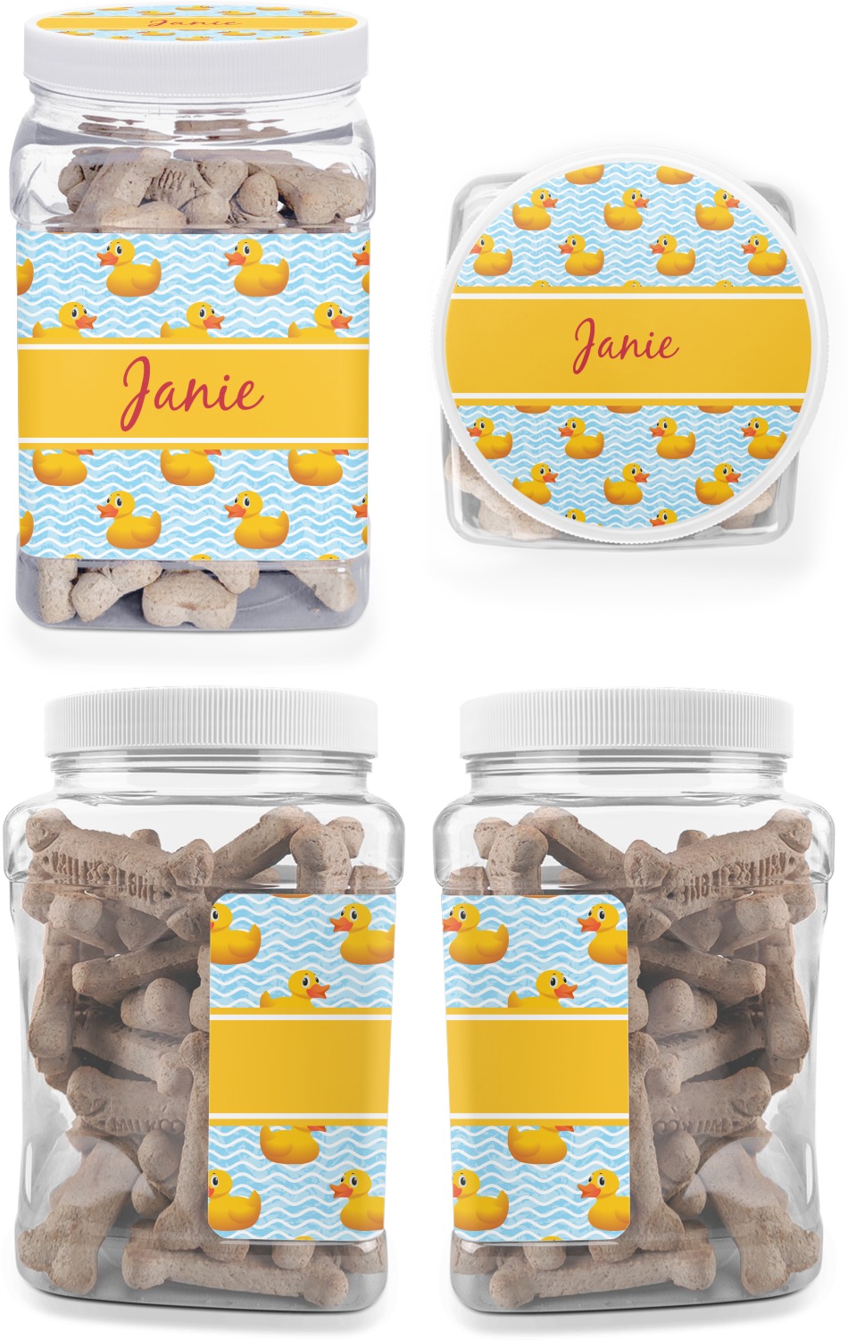 This half gallon jar, made from a sturdy plastic, is the perfect way to keep treats from any naughty pet paws, while still keeping them ready on hand for when your pup performs an impressive trick. This dog cookie jar features a screw-on, white lid that displays your personalized design on a vinyl sticker. We apply another customized sticker that wraps around the front and sides of the jar. Our dog treat jar also has indentations on the rear ends of the sides, which allows for convenient handling, and its square frame allows for easy storage.