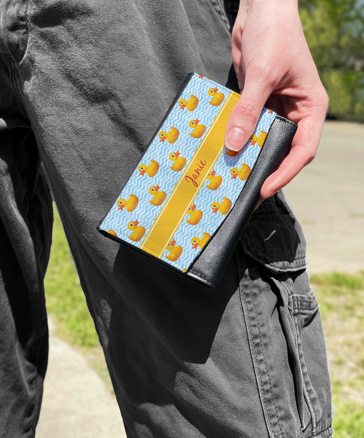 The compact size of this wallet - 5.5in wide, 3.5in tall and 0.75in thick when folded - makes it perfect to hold in hand and small enough to fit in a clutch or a normal size purse. The outside flap is customized with your choice of artwork and closes with a snap closure - with two different snaps to allow it to be adjusted when storing more items - to securely fasten the flap.