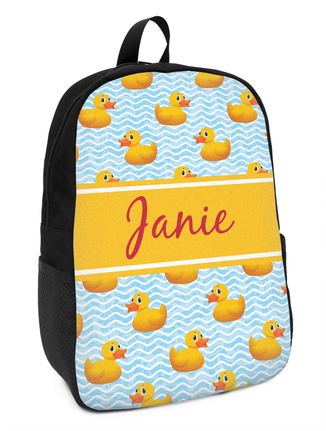 These small backpacks are made of a durable black canvas material with your personalization right on the front. The two shoulder straps are padded and easily adjustable. The bag itself measures at about 11" W x 15" H x 5" D. It's the perfect size for elementary aged kids or adults who want a smaller backpack. On the top of the bag you will find a handle to hang or carry your backpack by as well as a large zipper closure to keep all of your belongings safe inside. On each side of your backpack is a mesh pocket for a small item or water bottle. Inside your backpack you will find a spacious area with a small zipper pocket and a padded laptop slot that will fit up to a 13" laptop (13" being very snug). This is the perfect bag for any student that needs a couple books and their laptop with them at all times. It also works great as a carry on for traveling!
