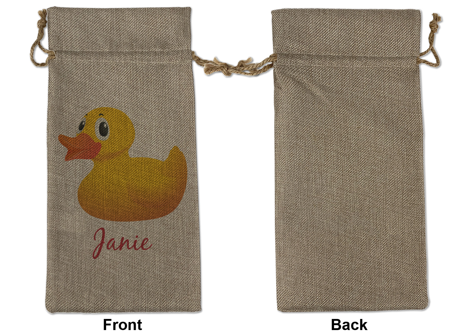 We sell our Burlap Gift Bags in 3 variant sized bags. Made with burlap polyester, each personalized bag can be secured with a twine drawstring pull. Your custom design is available to print on one side or both sides - completely up to you! The sizes of the bags measure approximately 4.5" x 6.5" for the smallest size, 6.5" x 8.0" for the medium size, and 6.5" x 13.5" for the large-sized bag.