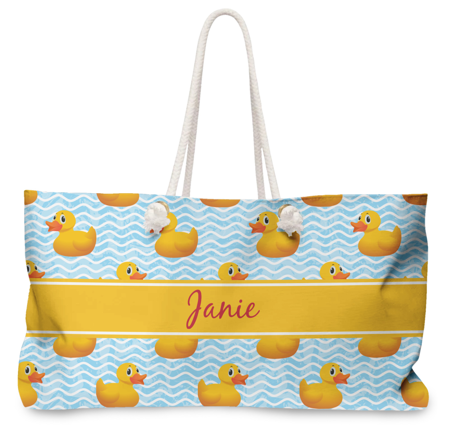 Our oversized weekender tote with rope handles is perfect for your weekend at the beach or on the town. This large tote are 24" W X 13" H, with a 5" gusset and a 27" thick rope handles with a knot that is put through a grommeted brass hole.