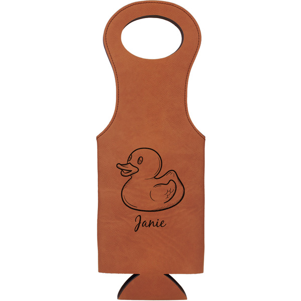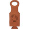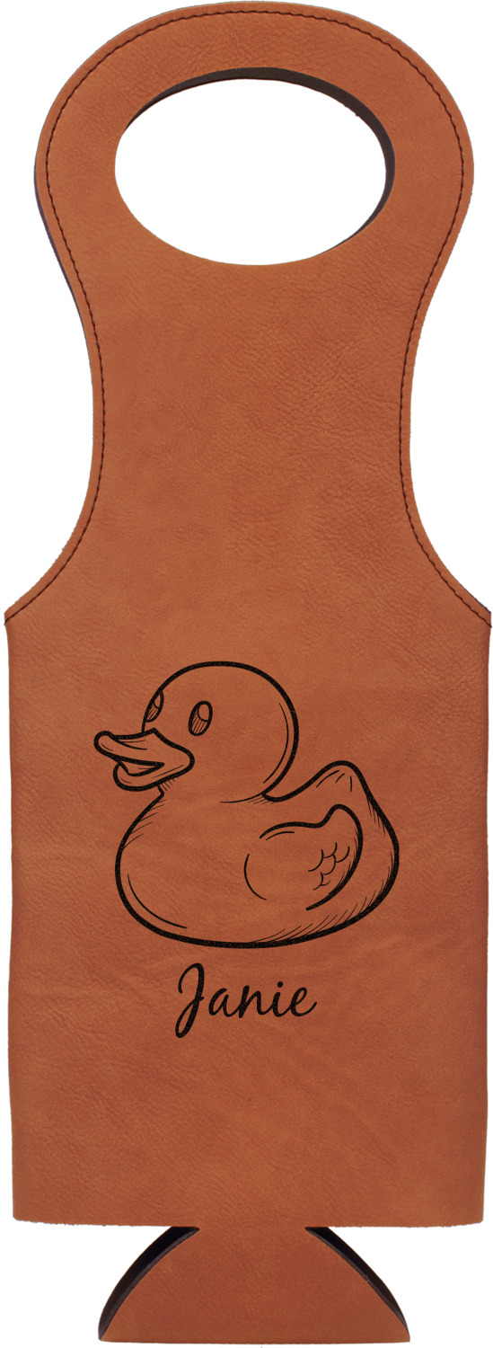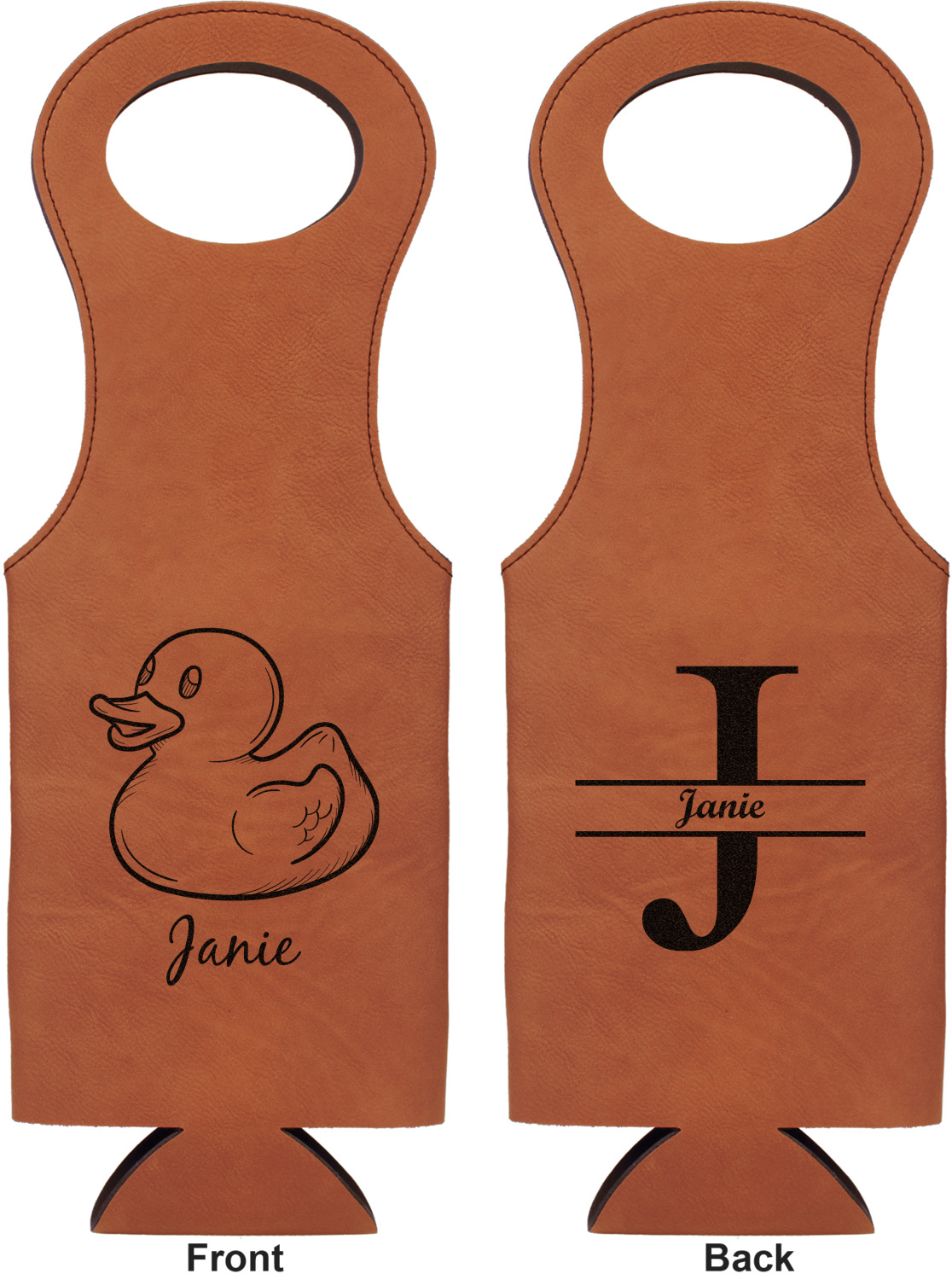 This wine carrier is made from a stunning leatherette, in a cognac-brown color. Strong, black stitching lines the sides of your wine bottle bag and provides extra durability. The interior is lined with a padded, black material to allow for a snug fit once your bottle is placed inside. At the top of this wine gift bag, you'll find two oval shaped handles that elegantly complements the rest of the bag's style. We provide you with the option of laser-engraving the front, or the front and back of your new personalized wine bag!