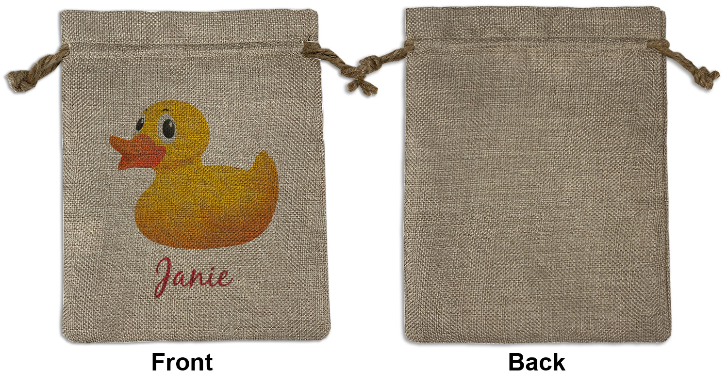 We sell our Burlap Gift Bags in 3 variant sized bags. Made with burlap polyester, each personalized bag can be secured with a twine drawstring pull. Your custom design is available to print on one side or both sides - completely up to you! The sizes of the bags measure approximately 4.5" x 6.5" for the smallest size, 6.5" x 8.0" for the medium size, and 6.5" x 13.5" for the large-sized bag.