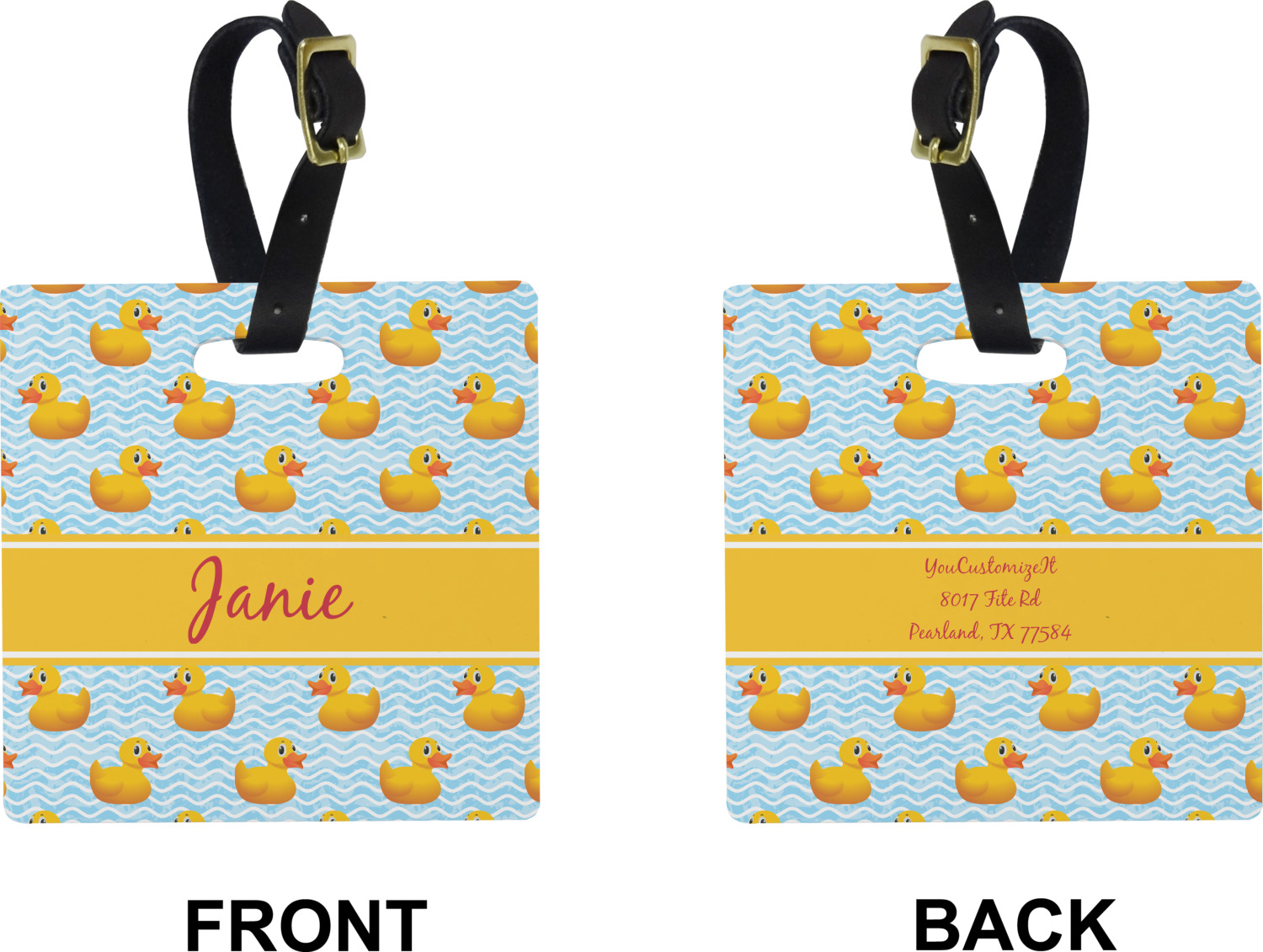 These personalized bag tags are sold in a variety of shapes, so that you may find the product that meets your vision exactly. We sell a round luggage tag, which measures at approximately 4" x 4". Our square luggage tag is about 3.5" x 3.5", while our rectangular version is 2.75" x 4 ".