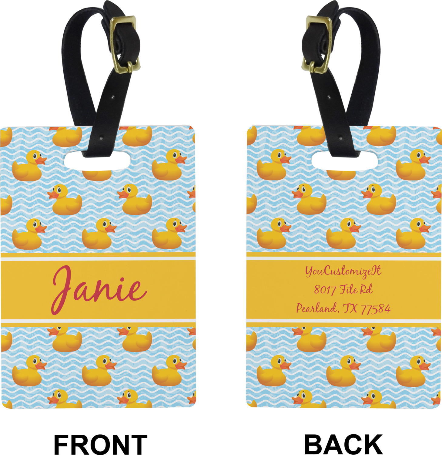 These cute luggage tags are made of a fiber-reinforced, UV-resistant plastic, making them waterproof and durable enough for both everyday use and the rugged adventures of any traveler! A leather strap with holes and a buckle is included with your purchase and can be used to attach your custom luggage tag to any suitcase, backpack, or duffel bag. You can design these travel tags as you wish; your customization will be displayed across the front, while the back will show as little or as much personal information as you want.