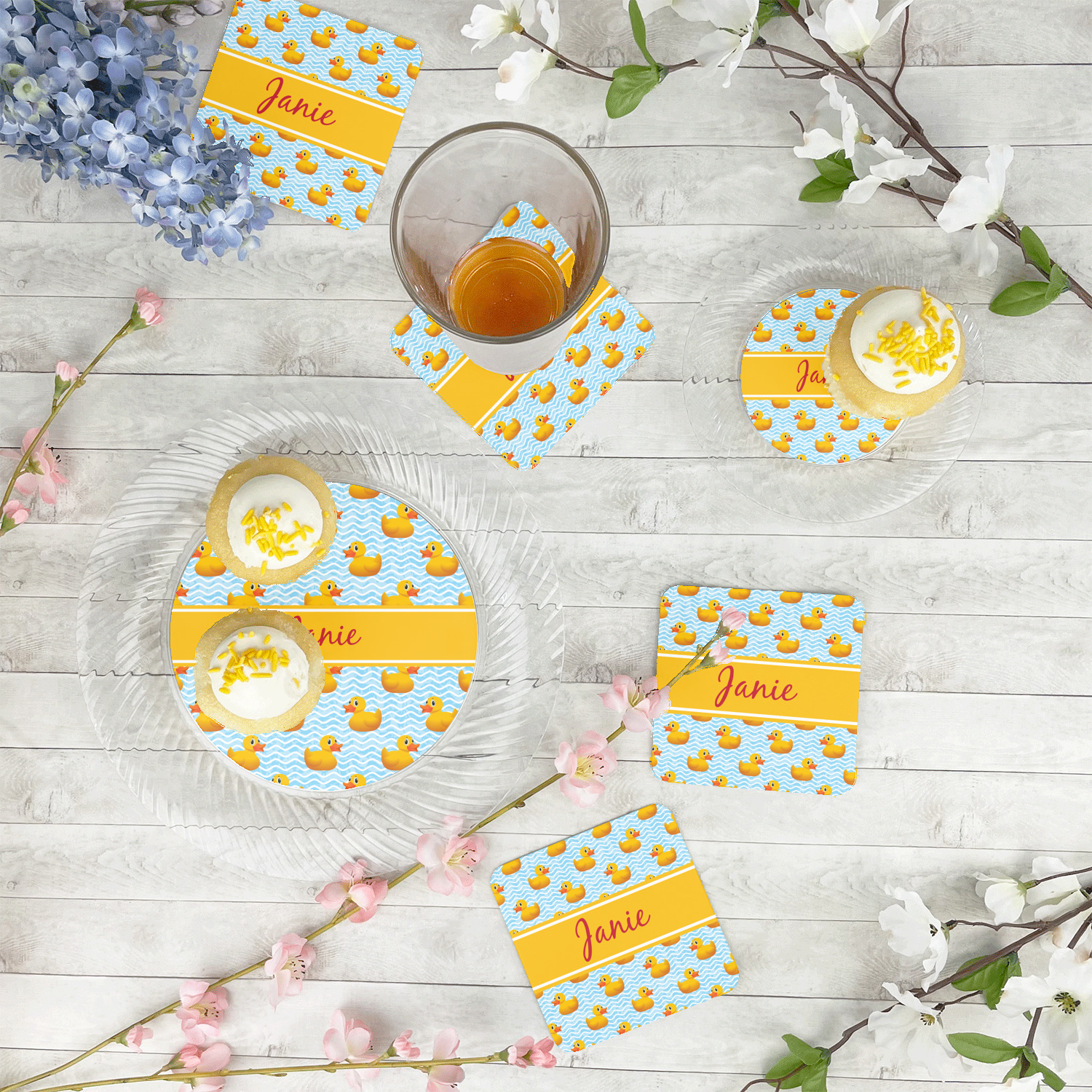Rubber Duckies are as popular as ever. Our rubber duckie design features traditional yellow rubber duckies on a waves background. The duckies are floating around in water. Cute, adorable and simply precious are words that come to mind when looking at this design.