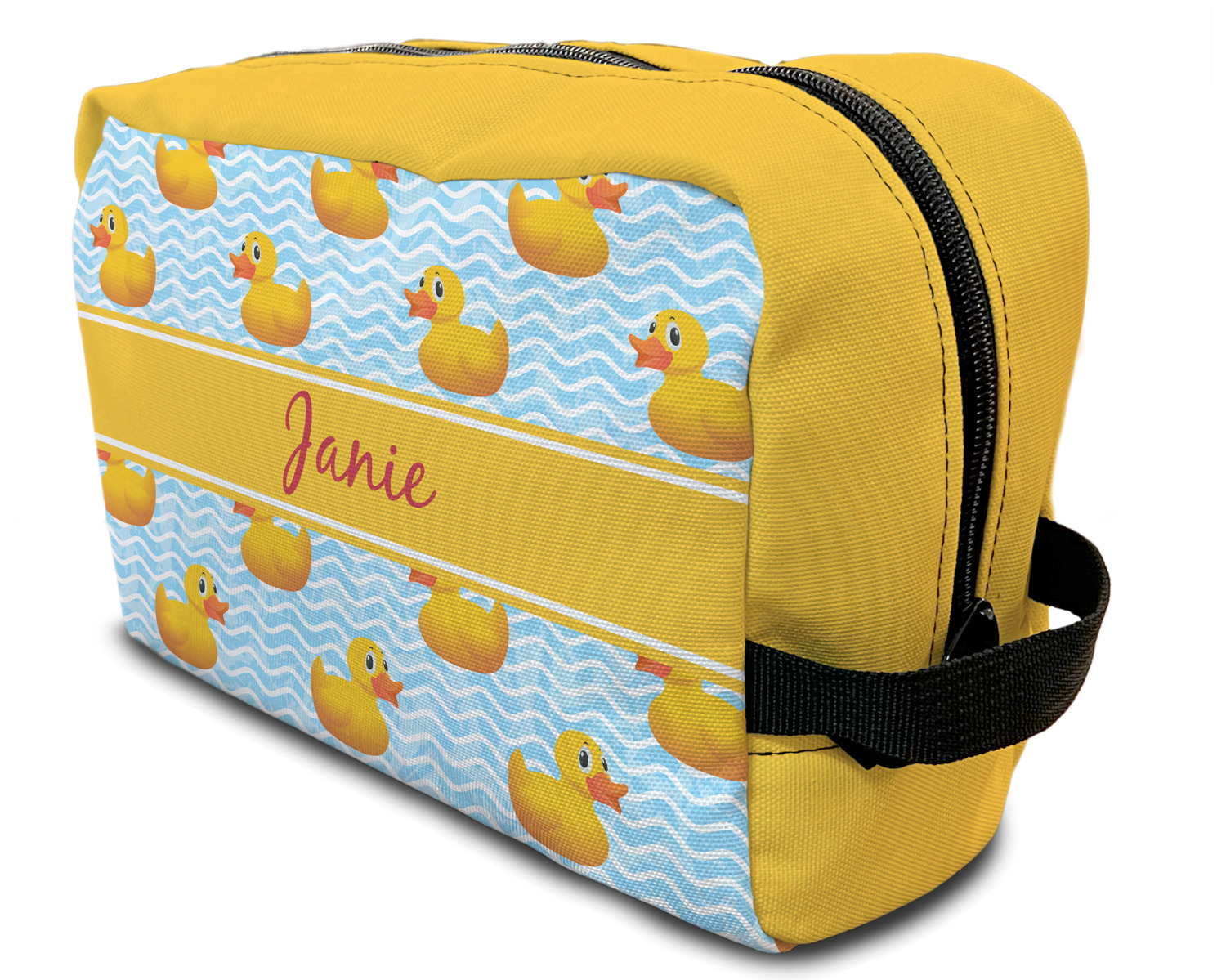 Our toiletry bag has the traditional dopp kit design i.e. a side to side zippered closure, giving you easy access to all the contents inside and a sturdy handle on one side of the bag. The canvas fabric for dopp kits is printed, then cut and sewn here in the USA.