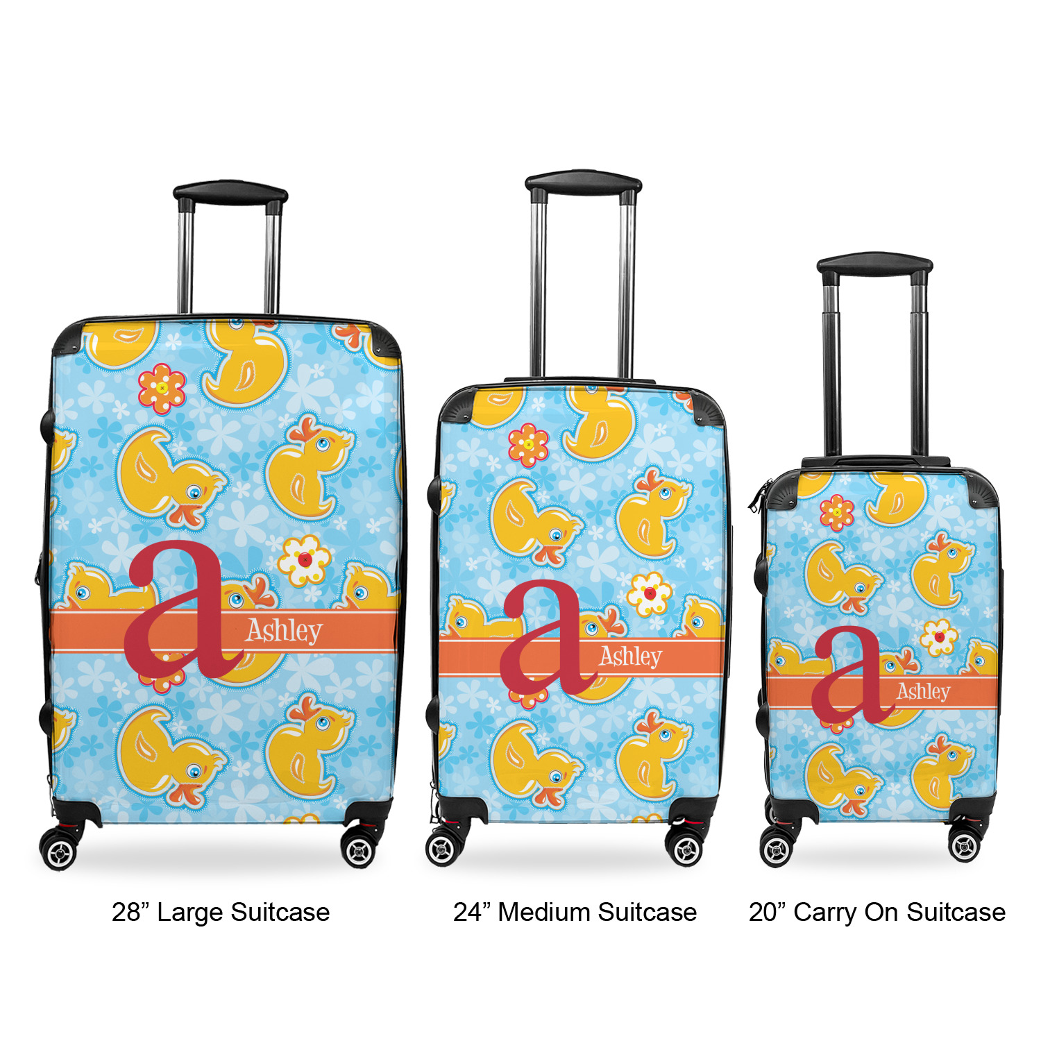Your suitcases will be personalized on the front, while the back and sides are a sleek charcoal color. On the side opposite of the side handle there are rubber feet to allow it to safely lay on its side on a luggage belt. These are a lightweight hard shell luggage option that will fit just about anyone's needs. The sizes and weights of each suitcase are below:
