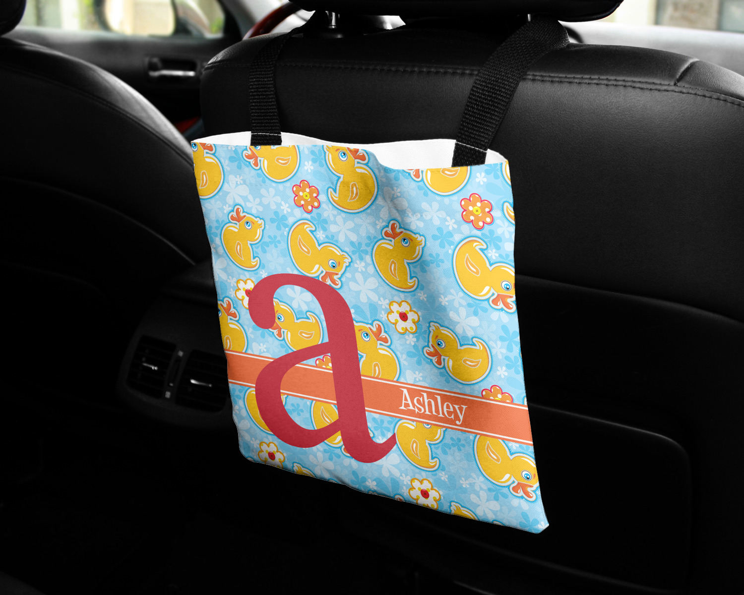 These car back seat organizers are sturdy tote-like bags, fabricated from a robust polyester, and features a single handle on the back side. The strap features an attachable velcro for easy attachment to headrests, grocery carts, car seats, and more. Simply undo the velcro, loop the strap around the headrest, reattach the velcro, and let the organizer hang from the front seat. These car organizers are the perfect means of increasing your backseat's legroom, while storing multiple items in one place for better accessibility. Each car back seat organizer measures at 10 by 10 inches, and features your personalized design printed across its front and back.