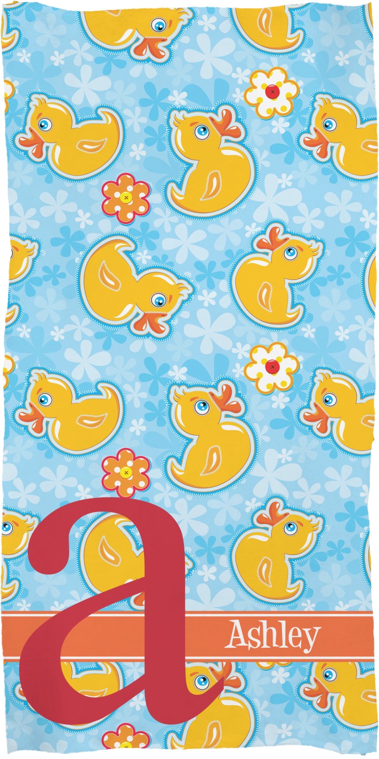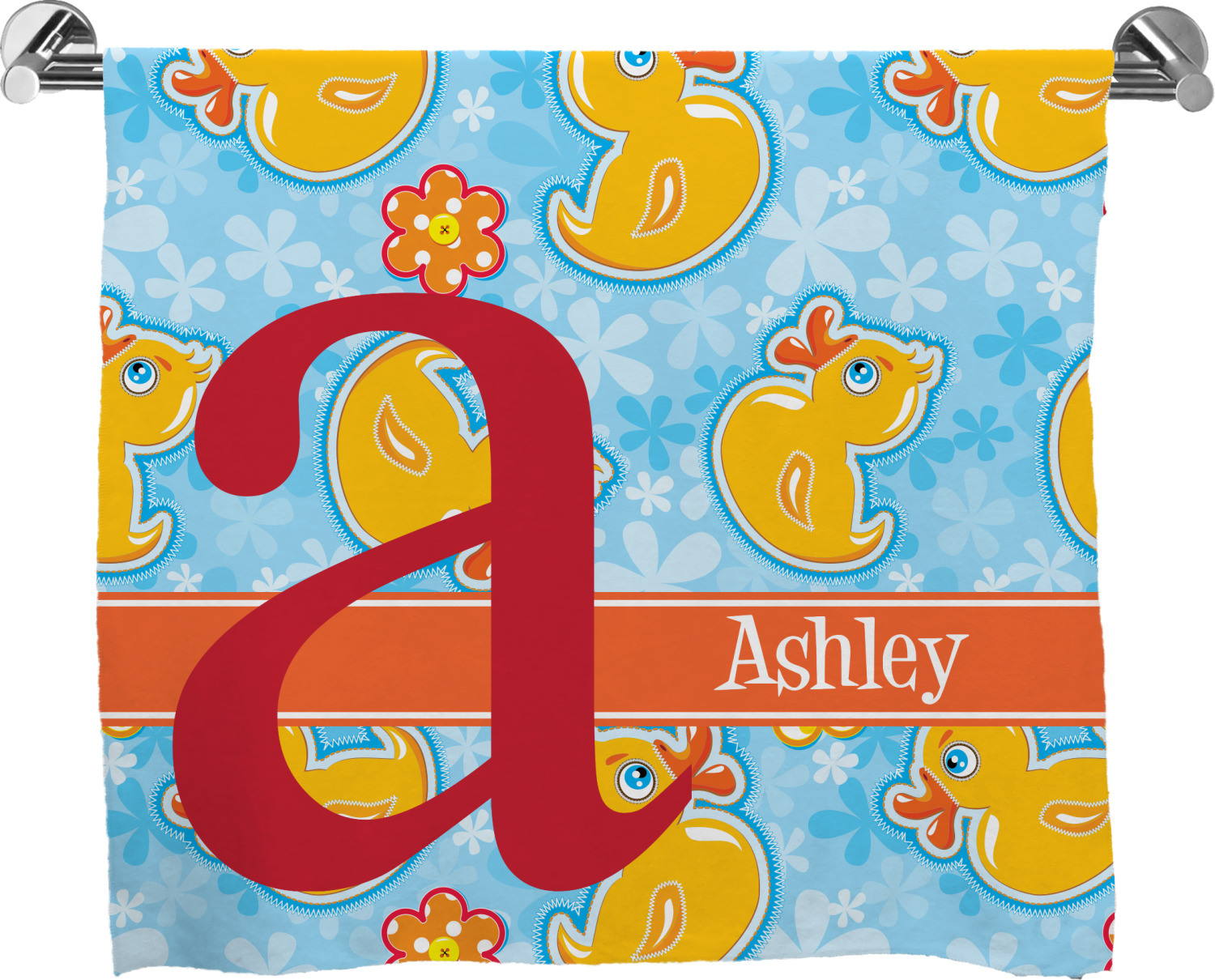 These customized bath towels are slightly larger than your standard towel and are the ideal size for wrapping around your body. They measure approximately 60" x 30". Your customization is displayed across the entire front face of the towel, while the back is white.