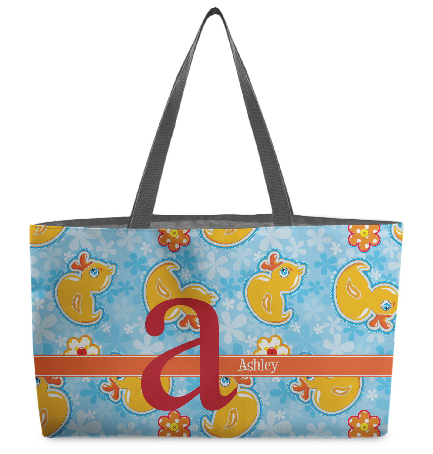 These beach totes are handmade here in the USA. Fabric is printed with your design. The tote is then sewn from the fabric pieces, lining and handles added.