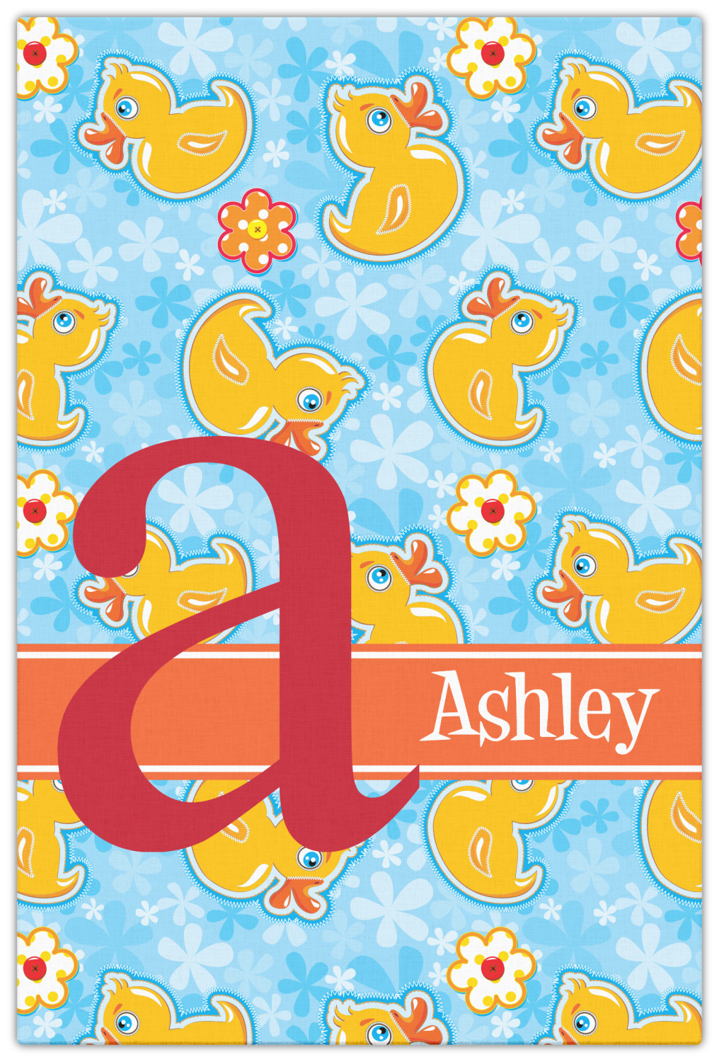 This duckie design is absolutely precious. The background is flowers in a lovely blue, while the foreground has duckies and flowers. The ducks and flowers look like they have been appliqued on to the fabric.