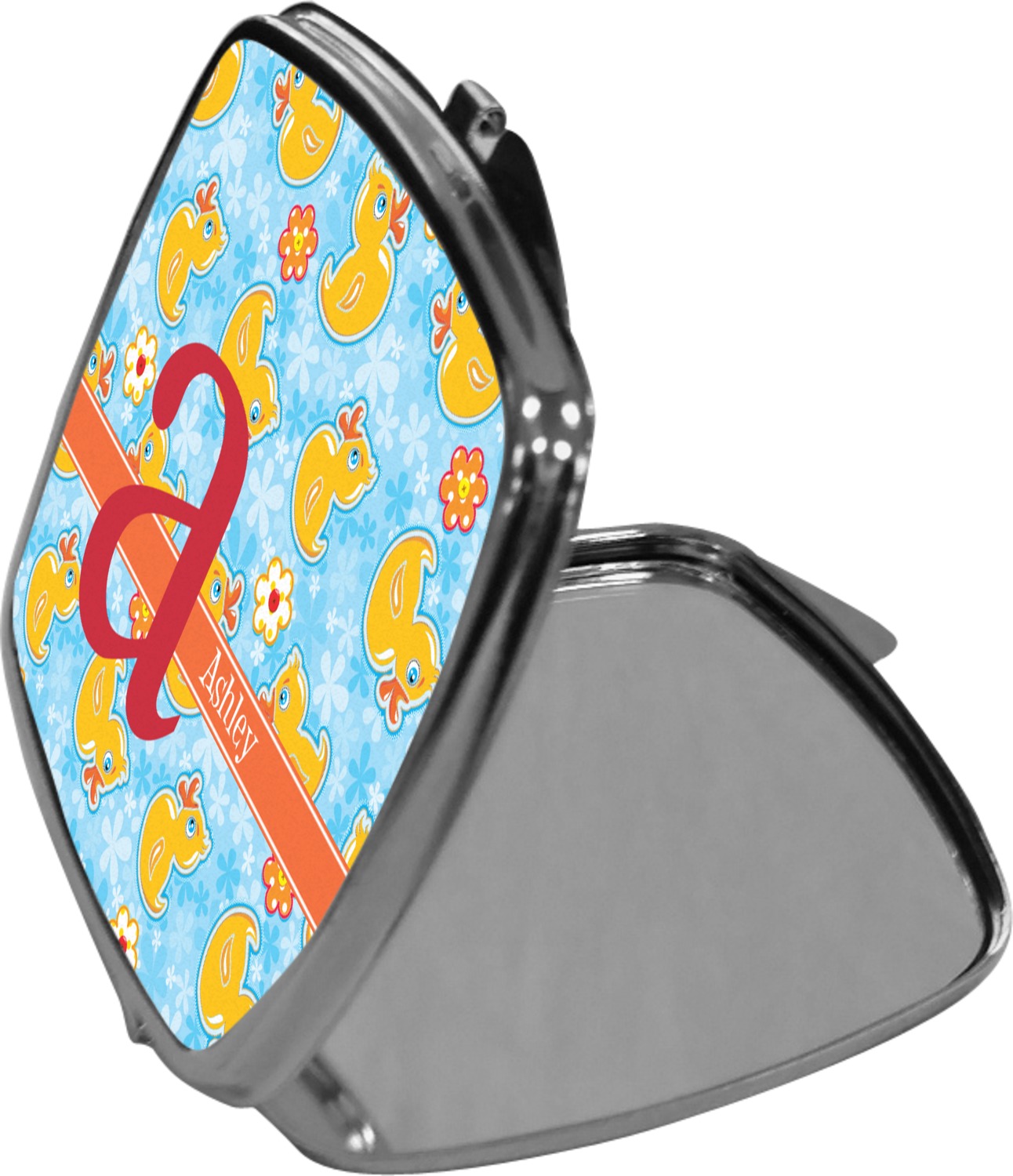Our compact mirrors are customized with your design on one side. The other side is patterned silver tone metal. Inside, there are two mirrors.