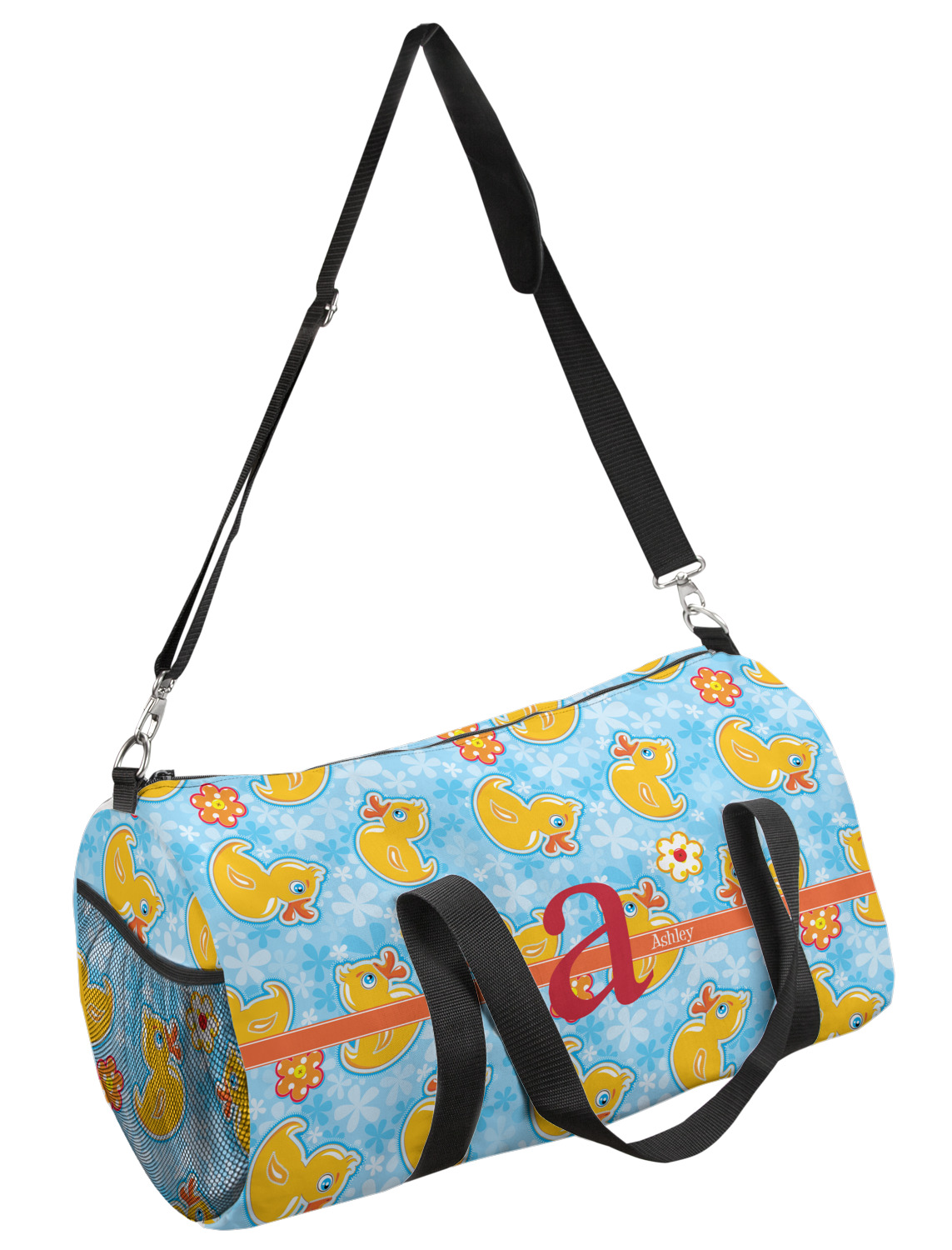 This duffle is a sturdy bag made of a canvas material. It comes in two sizes: Small (19"W x 9.5"H x 9.5"D) and Large (23"W x 12"H x 12"D). The bag is a cylindrical shape with a black adjustable strap and two handles. On one side is an elastic pouch to put a waterbottle or other small item. Your product will be sublimated with your design and is able to be designed on the front, back, and sides. Be sure to remember that the straps may cut into parts of your design if you upload your own artwork.