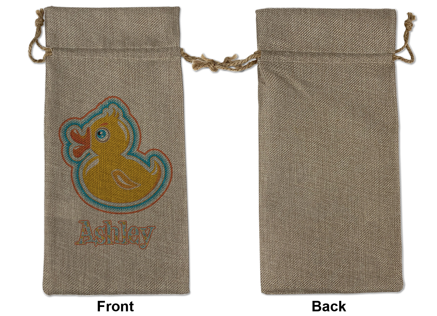 We sell our Burlap Gift Bags in 3 variant sized bags. Made with burlap polyester, each personalized bag can be secured with a twine drawstring pull. Your custom design is available to print on one side or both sides - completely up to you! The sizes of the bags measure approximately 4.5" x 6.5" for the smallest size, 6.5" x 8.0" for the medium size, and 6.5" x 13.5" for the large-sized bag.