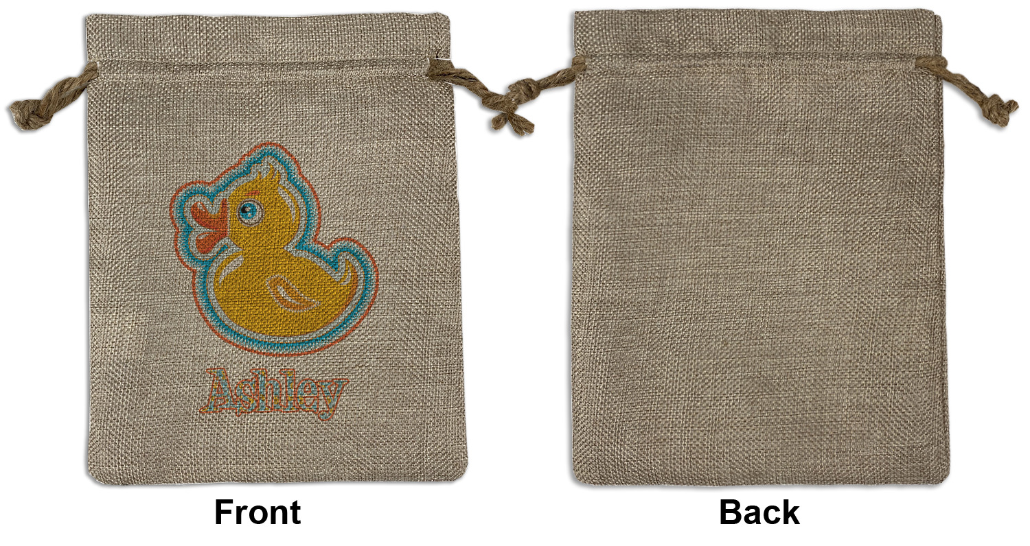 We sell our Burlap Gift Bags in 3 variant sized bags. Made with burlap polyester, each personalized bag can be secured with a twine drawstring pull. Your custom design is available to print on one side or both sides - completely up to you! The sizes of the bags measure approximately 4.5" x 6.5" for the smallest size, 6.5" x 8.0" for the medium size, and 6.5" x 13.5" for the large-sized bag.