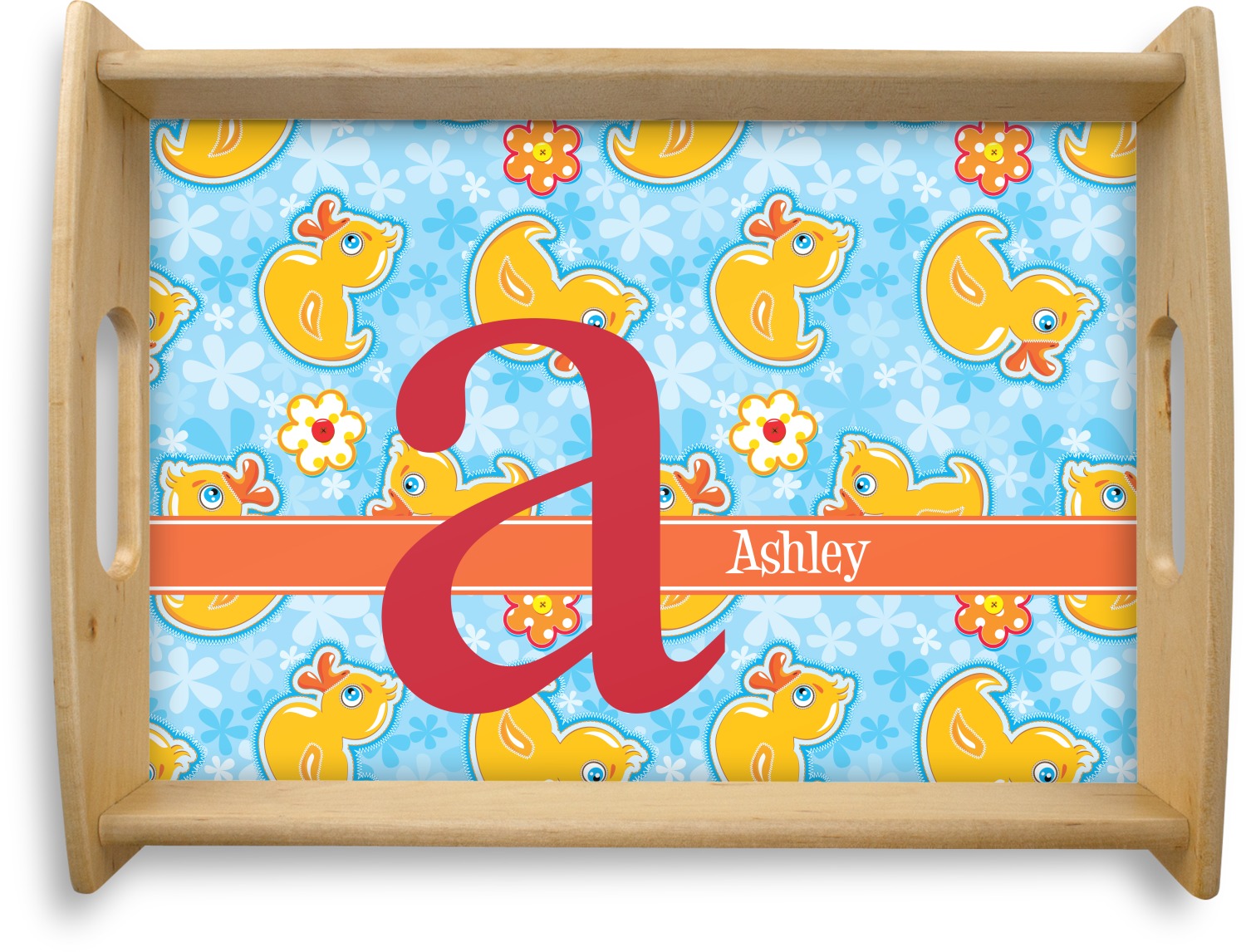 This serving tray with handles features square edges and two rounded sides, creating a very modern look. Each side is fabricated from a beautifully cut, natural wood. The bottom of the interior of the tray displays your customized design in bright, vibrant color. The tray is sold in both a black color and a natural wood look. Each variation of the wood serving tray has two sizes: Small, which is 14" x 10" x 2.25", and Large, which is 19.5" x 13.5" x 2.75".