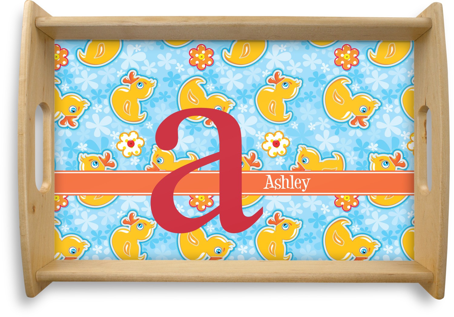 This serving tray with handles features square edges and two rounded sides, creating a very modern look. Each side is fabricated from a beautifully cut, natural wood. The bottom of the interior of the tray displays your customized design in bright, vibrant color. The tray is sold in both a black color and a natural wood look. Each variation of the wood serving tray has two sizes: Small, which is 14" x 10" x 2.25", and Large, which is 19.5" x 13.5" x 2.75".
