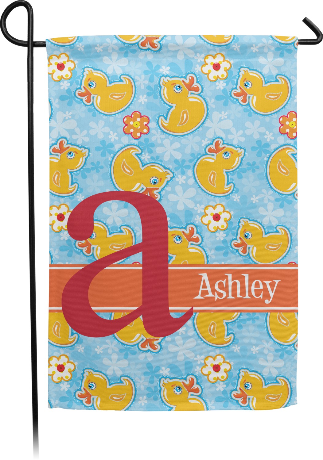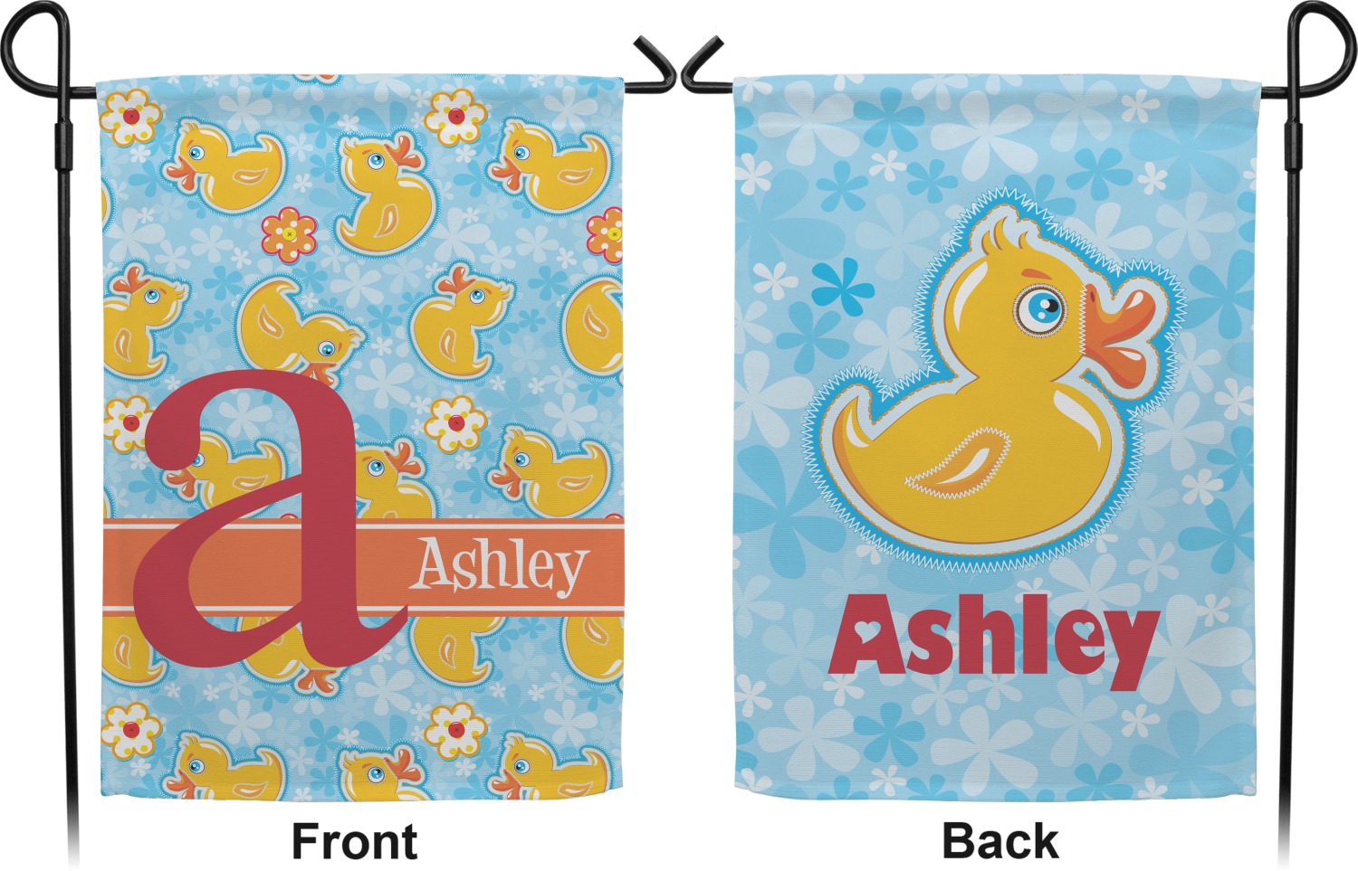 These custom garden flags are made of a durable, double-ply, polyester weave, allowing them to withstand the elements year round. The small flags measure at approximately 12 by 18 inches. The large flags measure out to 28 by 37 inches. You can order these decorative flags with your customization printed on the front only, or the front and back.