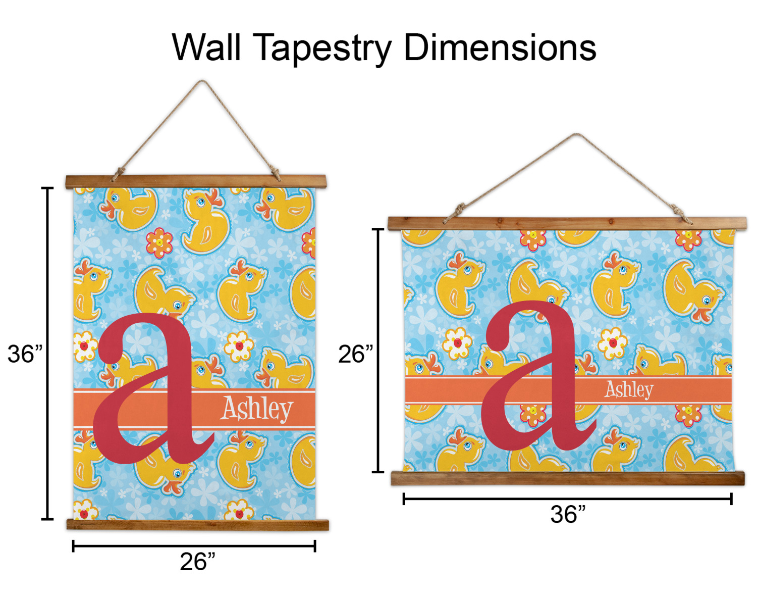 Made in two different orientations - portrait or landscape - both are 26" x 36". Your design is printed on a high quality polyester fabric with hemmed edges. The wood on the top and bottom of the tapestry is 1.25" tall and 0.25" thick and there are two pieces on top and bottom which sandwich the fabric.
