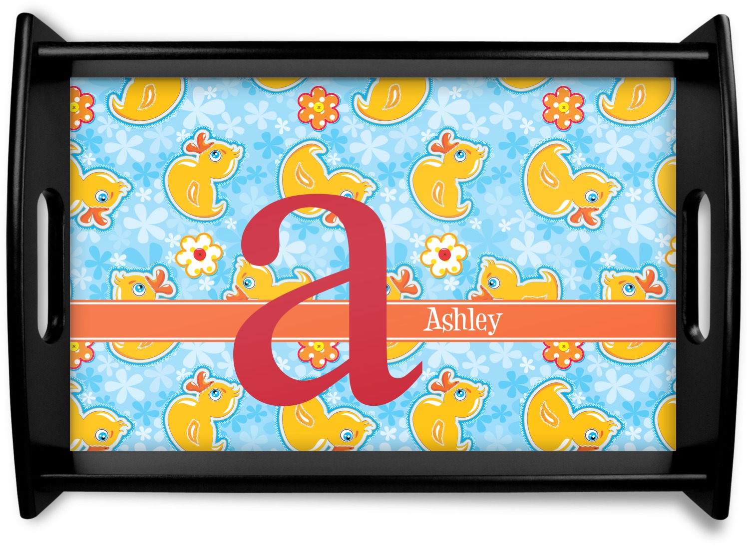 This serving tray with handles features square edges and two rounded sides, creating a very modern look. Each side is fabricated from a beautifully cut, natural wood. The bottom of the interior of the tray displays your customized design in bright, vibrant color. The tray is sold in both a black color and a natural wood look. Each variation of the wood serving tray has two sizes: Small, which is 14" x 10" x 2.25", and Large, which is 19.5" x 13.5" x 2.75".
