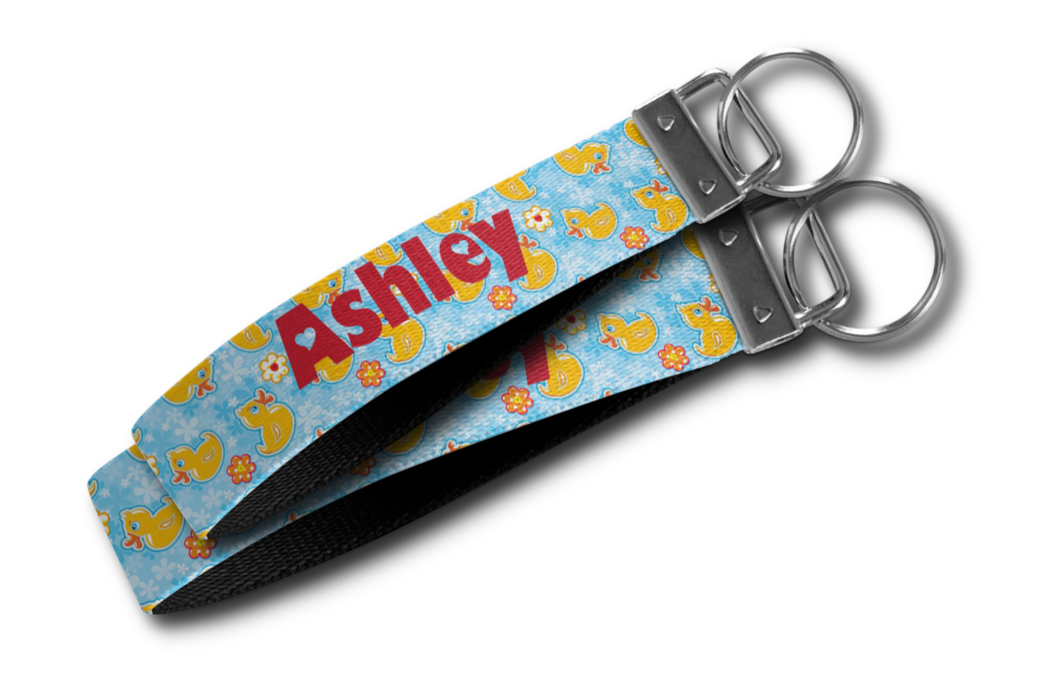 These key fob keychains are made from a polyester weave, right here in the USA. They feature a silver, metal clasp, attached to a round keyring. The piece gives the personalized wristlet a beautiful, finished look. Your customized design is printed on the outside of the keychain strap. We carry these wristlets in two sizes: small, which is 5 inches in width, and large, which is 5.5 inches in width.