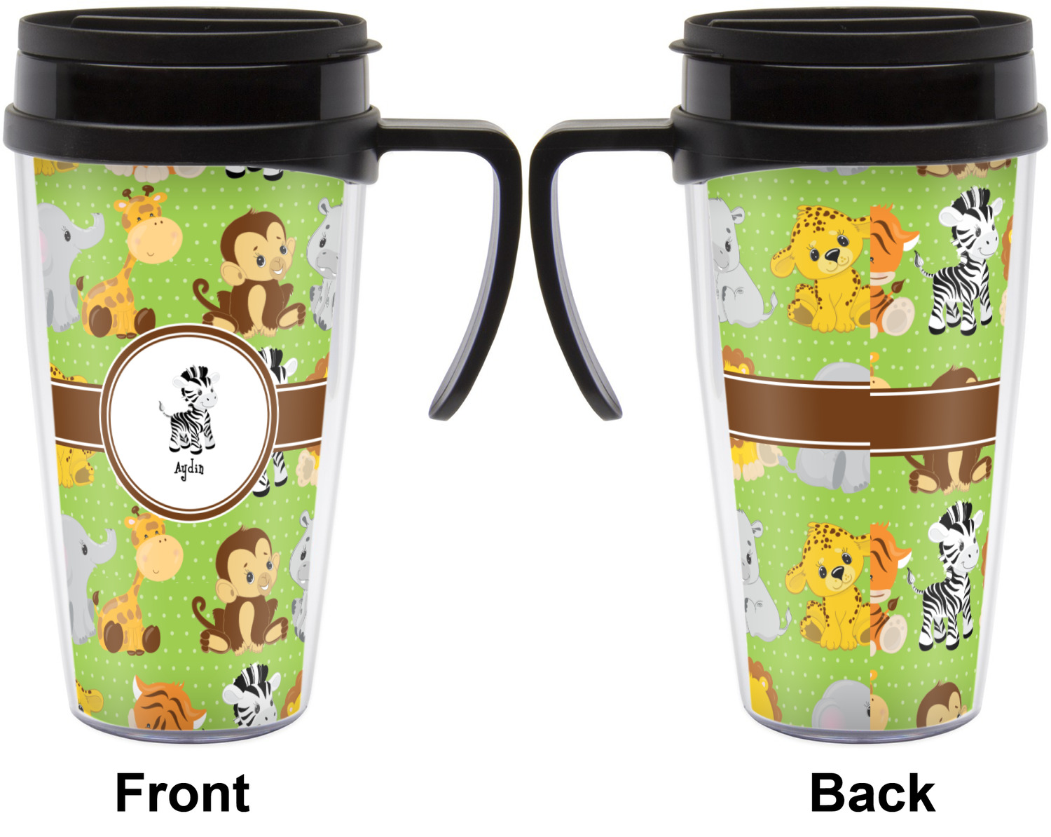 These thermal mugs are free of BPA, and insulated, to keep your drinks hot or cold. The black, snap on lid and the slider for sipping allows you to conveniently sip your drink without constantly worrying about a disastrous spill. We offer this mug with and without a handle, to better suit your needs. Each custom thermal mug holds up to 16 ounces of liquid and displays your customization on all sides on premium gloss media inserts.