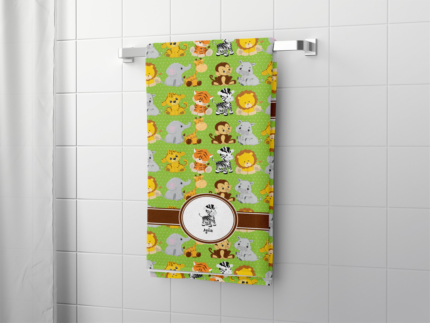These customized bath towels are slightly larger than your standard towel and are the ideal size for wrapping around your body. They measure approximately 60" x 30". Your customization is displayed across the entire front face of the towel, while the back is white.