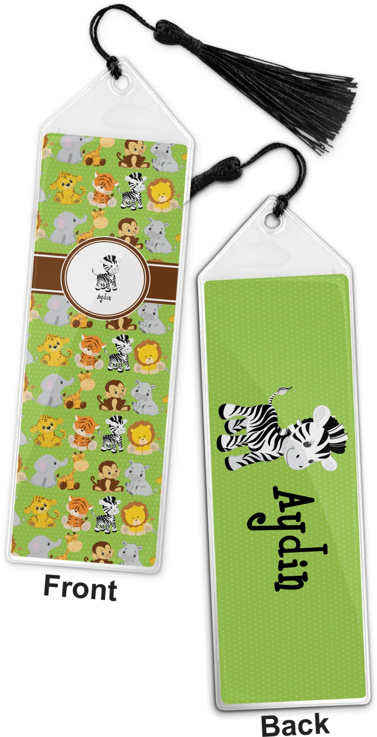 Your personalized bookmark is made of a sturdy, clear vinyl, and is approximately 7.5" x 2.25". We display your personalization on vinyl inserts that are placed on both sides. Accompanying each book marker is a black, fringe tassel that attaches to the reinforced, triangular header.