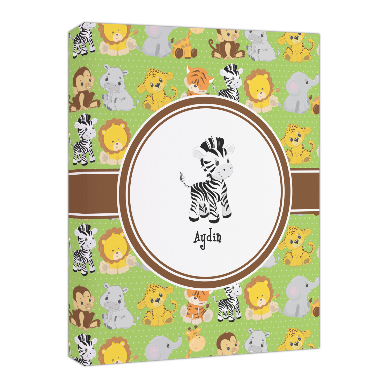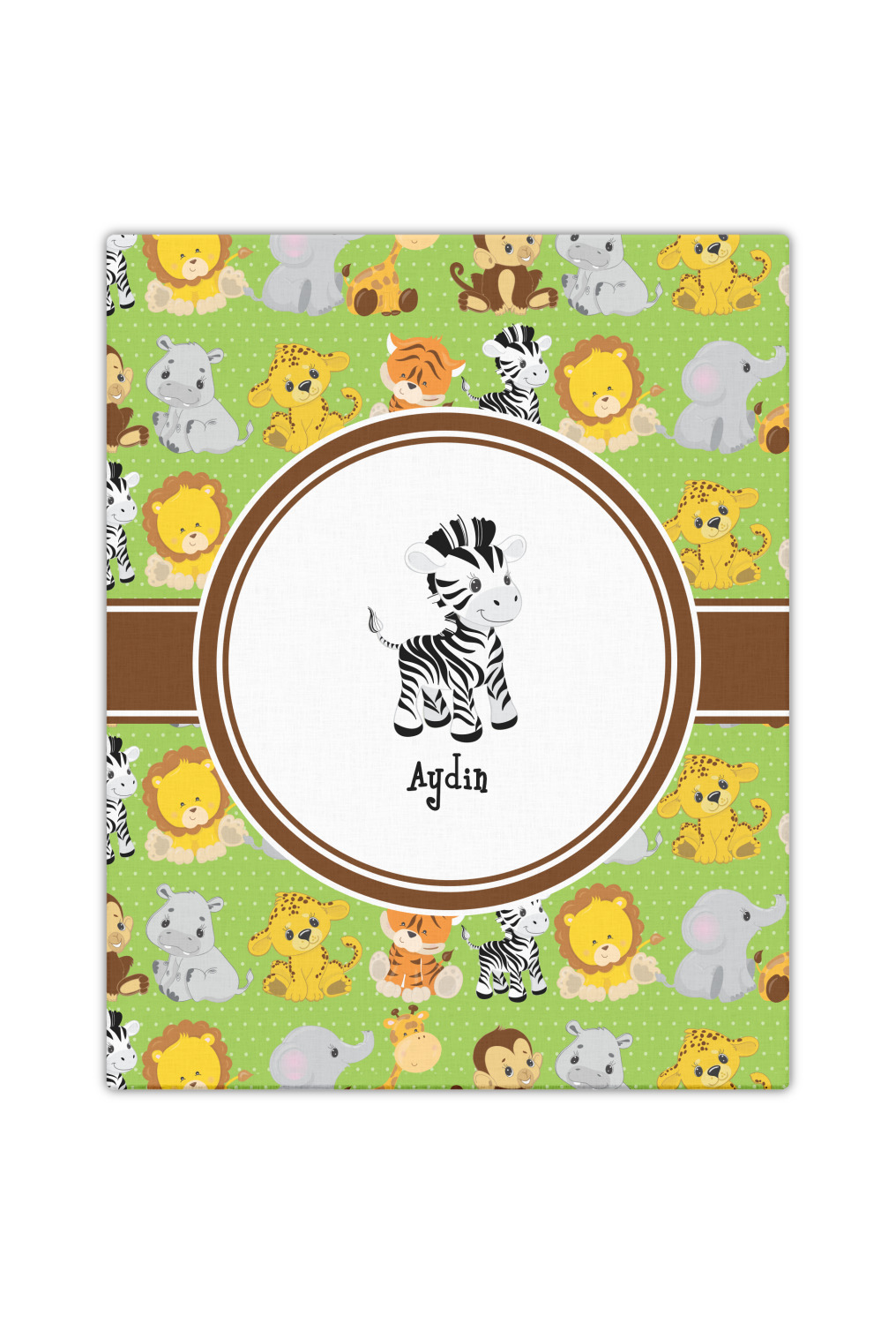 The design has classic ribbon along with a classic round label in a beautiful earth brown The label features a baby zebra in this design, however the choice of the baby animal is yours. You can select any of the baby animals to be featured on the label along with the child's name.