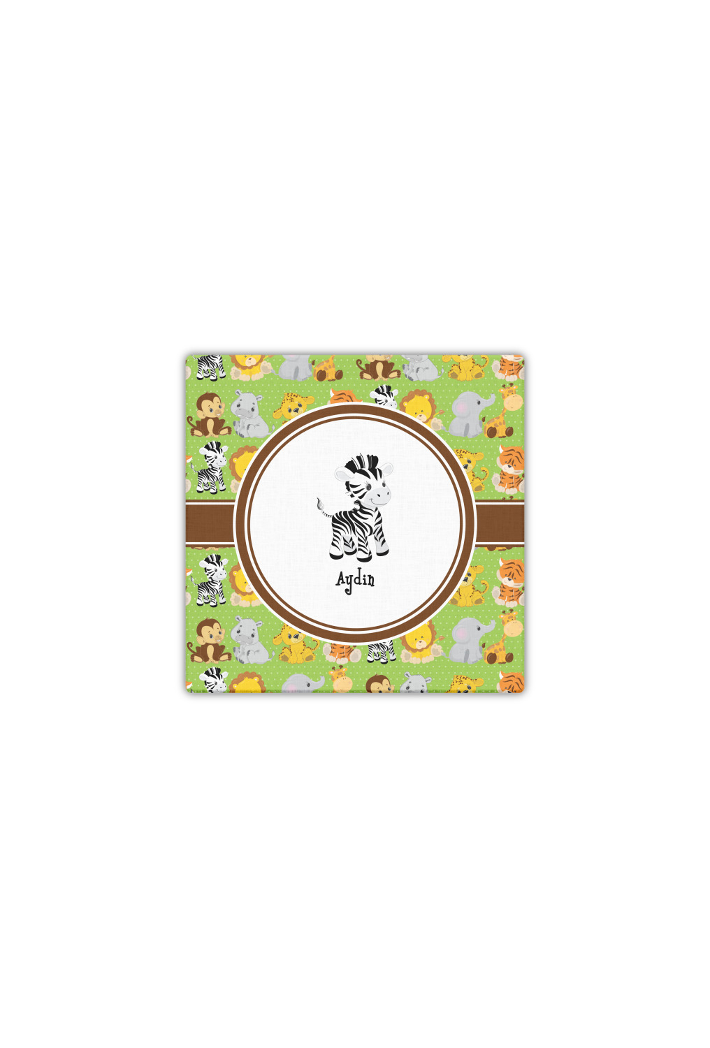 The design has classic ribbon along with a classic round label in a beautiful earth brown The label features a baby zebra in this design, however the choice of the baby animal is yours. You can select any of the baby animals to be featured on the label along with the child's name.