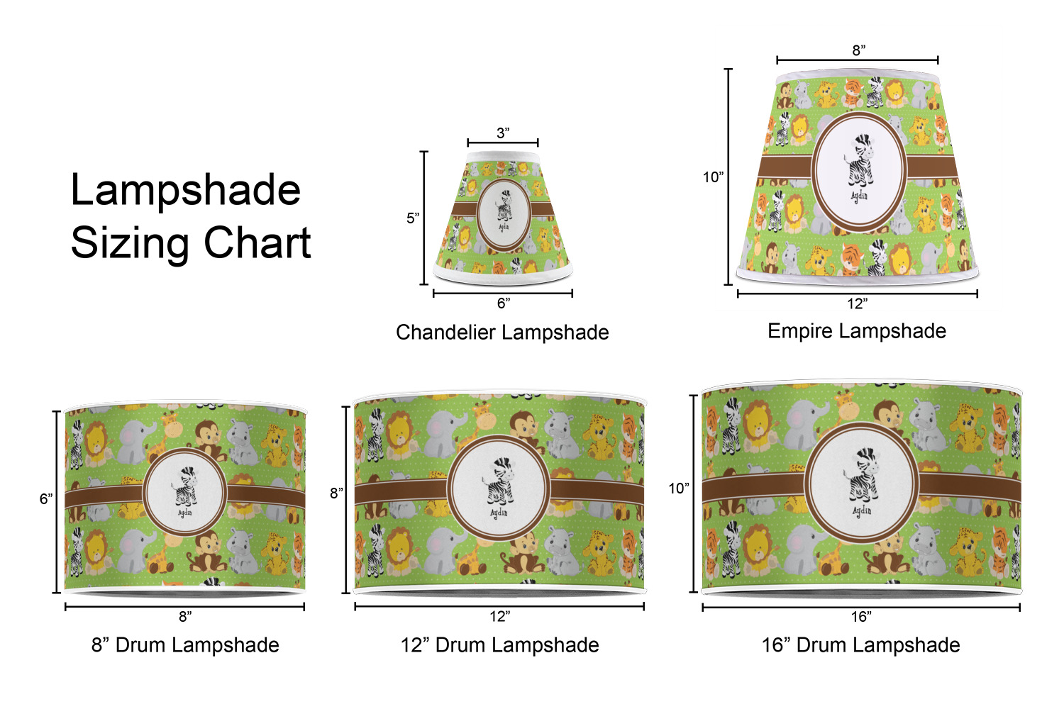 Our customized lamp shades also come in 3 different sizes: 8", 12" and 16", measuring at 8" in diameter by 6" tall, 12" in diameter by 8" tall, and 16" in diameter by 10" tall, respectively.