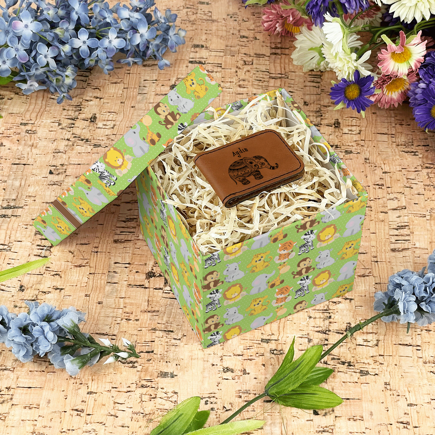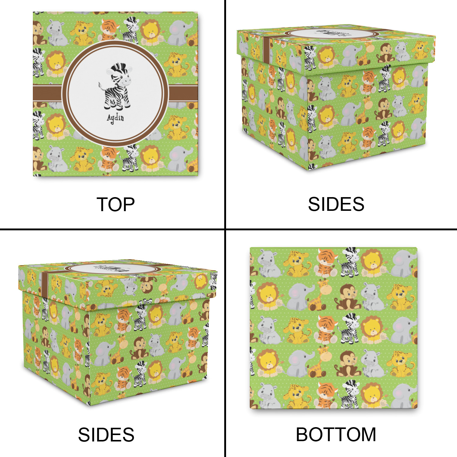 The design has classic ribbon along with a classic round label in a beautiful earth brown The label features a baby zebra in this design, however the choice of the baby animal is yours. You can select any of the baby animals to be featured on the label along with the child's name.