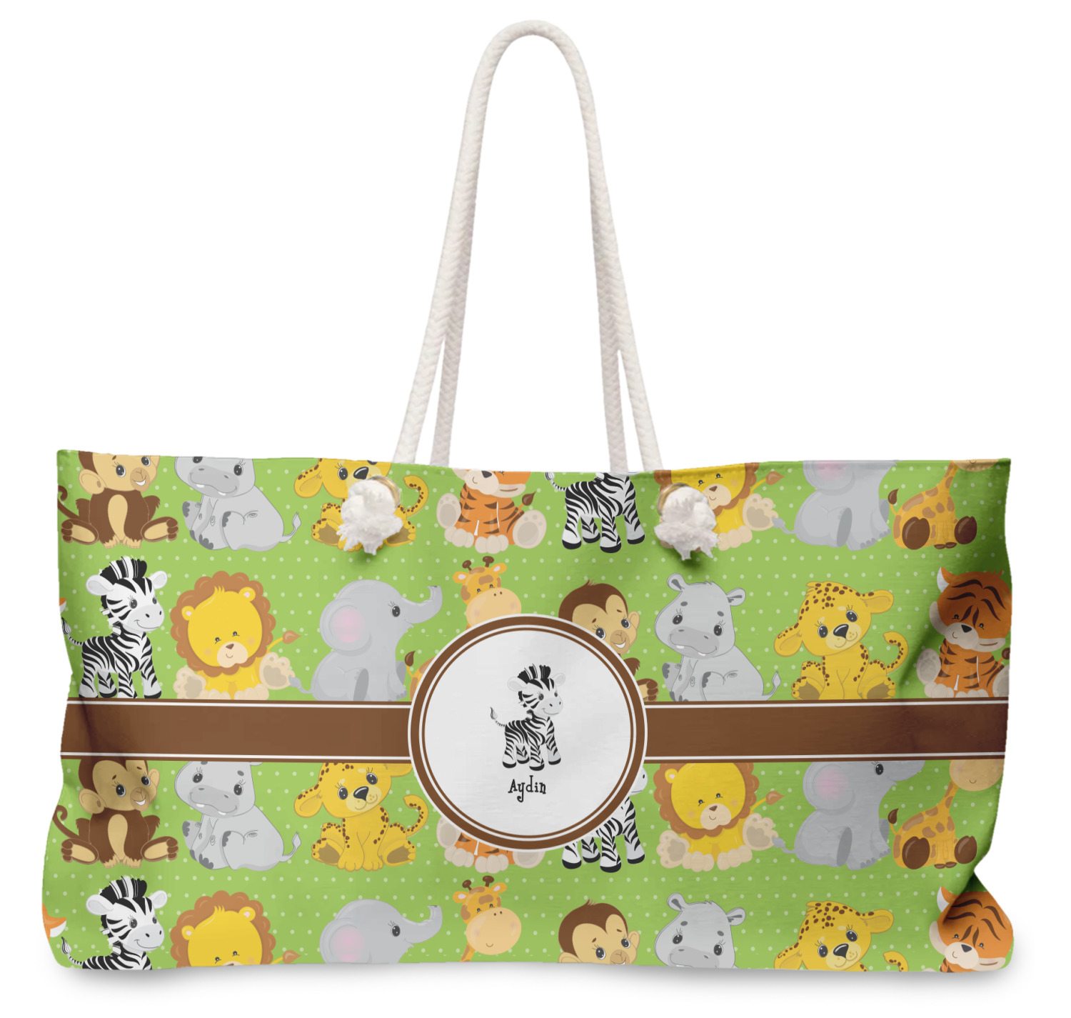 Our oversized weekender tote with rope handles is perfect for your weekend at the beach or on the town. This large tote are 24" W X 13" H, with a 5" gusset and a 27" thick rope handles with a knot that is put through a grommeted brass hole.