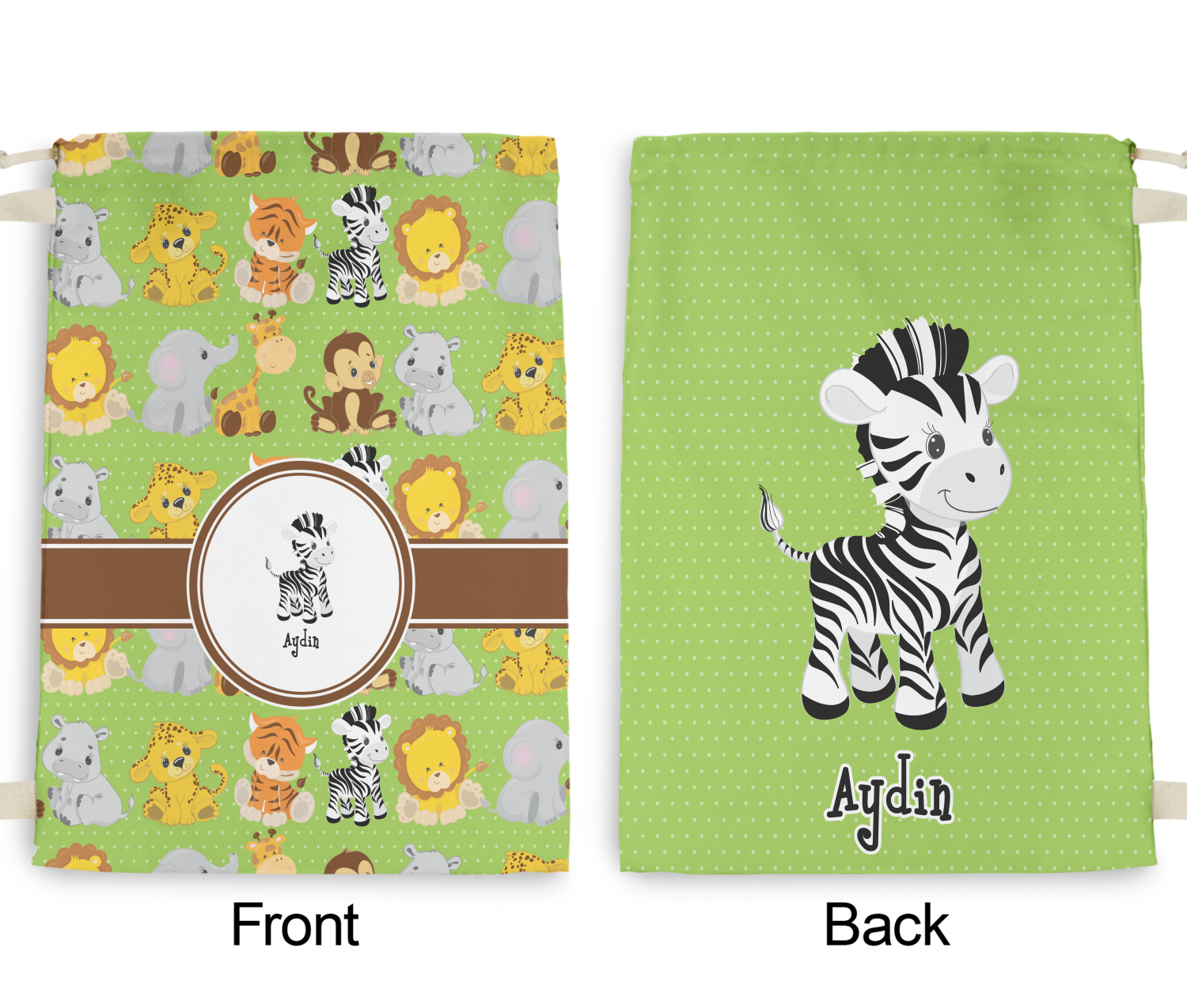 The design has classic ribbon along with a classic round label in a beautiful earth brown The label features a baby zebra in this design, however the choice of the baby animal is yours. You can select any of the baby animals to be featured on the label along with the child's name.