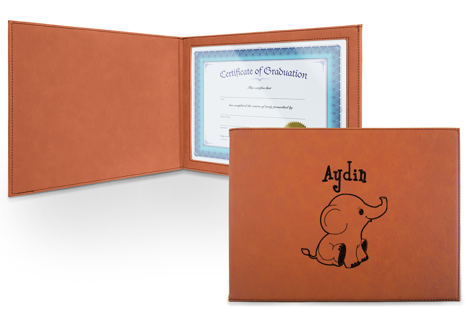 This cognac-colored, leatherette certificate jacket is the ideal way to display or store your hard-earned certificate. When closed, the custom certificate holder measures at 12 by 9 inches. The interior of the certificate cover includes a clear, vinyl window to encase your diploma. The window measures at around 10.5 by 7.5 inches and can accommodate a diploma that measures at up to 8.5 by 11 inches. You can either choose to have your customization laser engraved on the front and interior, or solely the front.