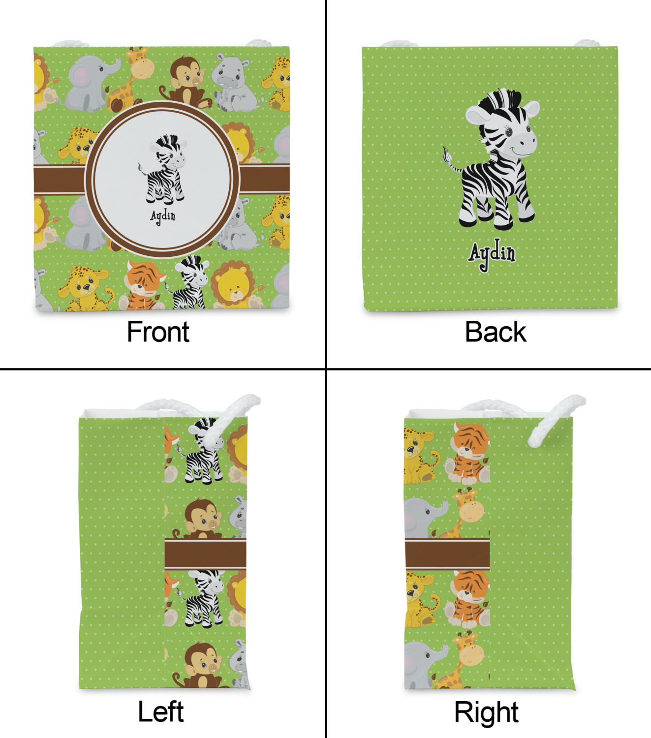 The design has classic ribbon along with a classic round label in a beautiful earth brown The label features a baby zebra in this design, however the choice of the baby animal is yours. You can select any of the baby animals to be featured on the label along with the child's name.