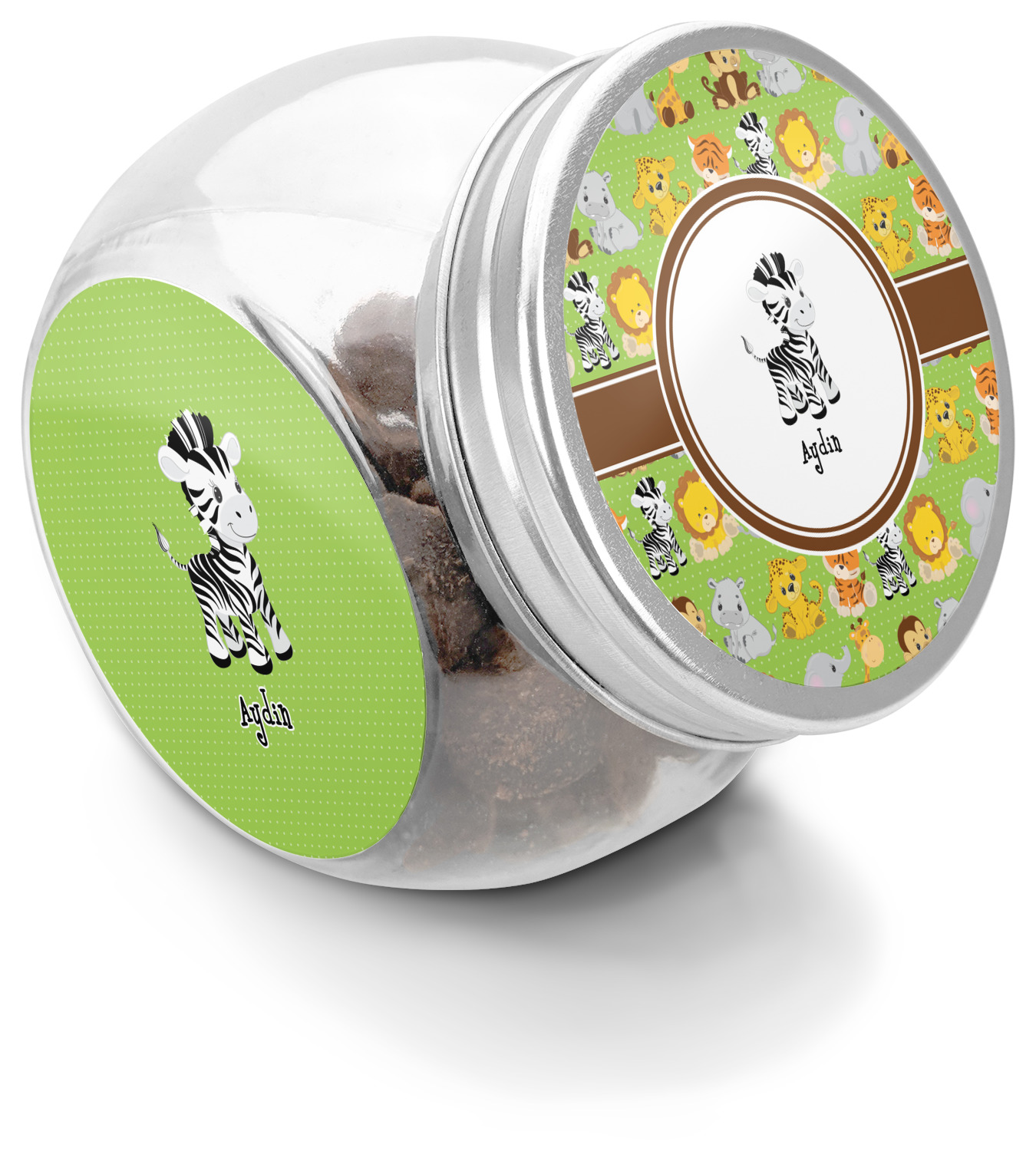 This treat jar is an excellent way to store treats for your favorite canine or feline. Moreover, their delicate, classy appearance makes them a tasteful addition to your countertop's décor. Crafted from clear glass, its unique construction and silver metal, screw-on lid allows for quick and easy access. Three, permanent, vinyl stickers are applied to both sides of the jar and lid, presenting your personalized design. The base of this glass, dog treat jar is 3.4" x 4.75", and the jar stands at 5" tall. Though on the smaller side, this jar is best suited for smaller treats or training treats.