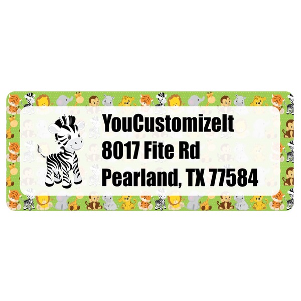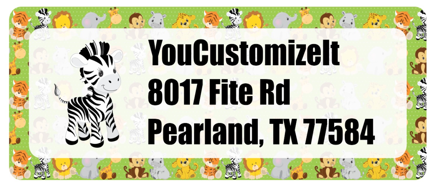 The design has classic ribbon along with a classic round label in a beautiful earth brown The label features a baby zebra in this design, however the choice of the baby animal is yours. You can select any of the baby animals to be featured on the label along with the child's name.