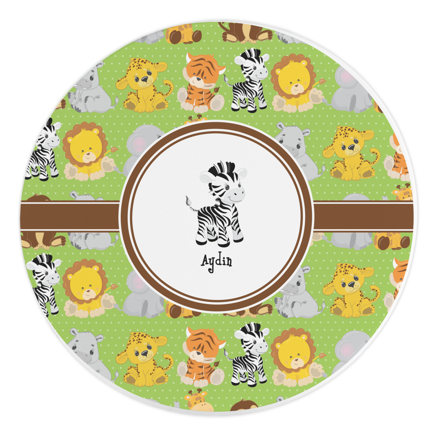 The design has classic ribbon along with a classic round label in a beautiful earth brown The label features a baby zebra in this design, however the choice of the baby animal is yours. You can select any of the baby animals to be featured on the label along with the child's name.
