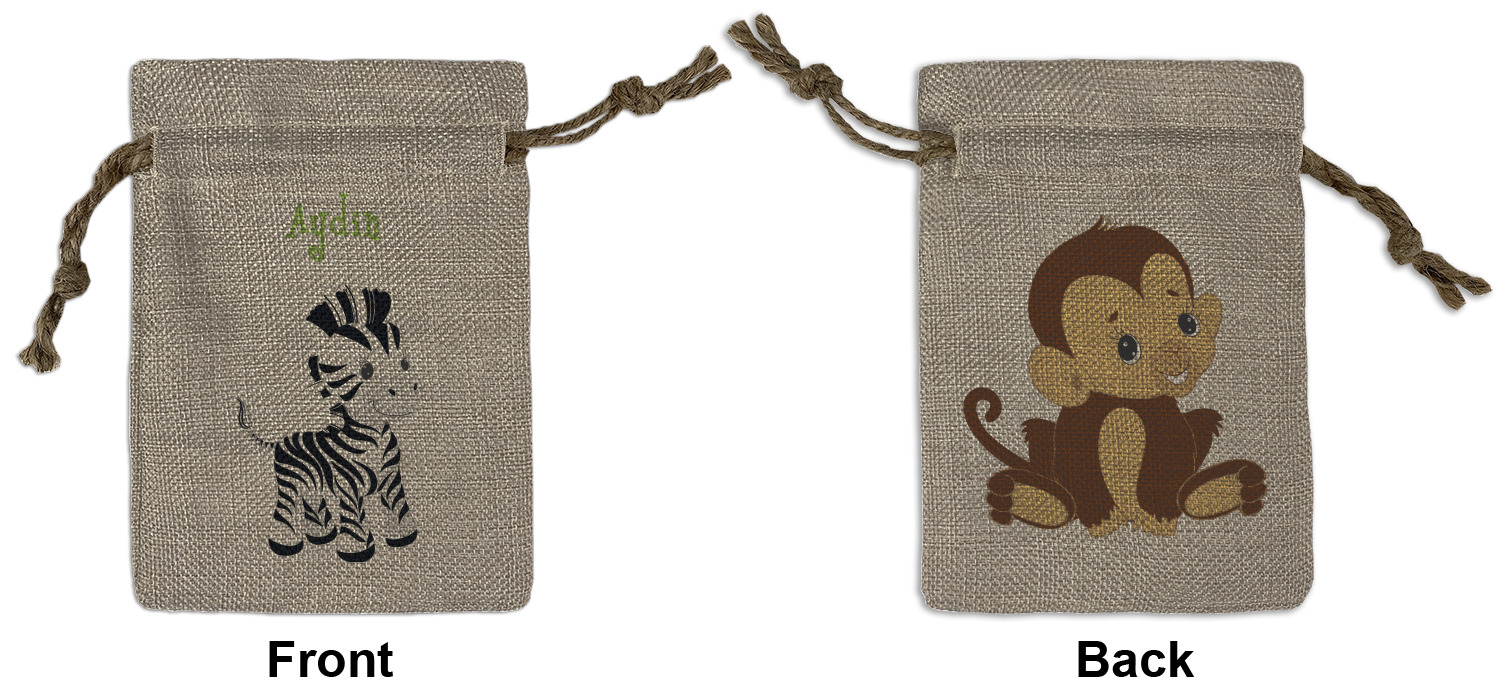 We sell our Burlap Gift Bags in 3 variant sized bags. Made with burlap polyester, each personalized bag can be secured with a twine drawstring pull. Your custom design is available to print on one side or both sides - completely up to you! The sizes of the bags measure approximately 4.5" x 6.5" for the smallest size, 6.5" x 8.0" for the medium size, and 6.5" x 13.5" for the large-sized bag.