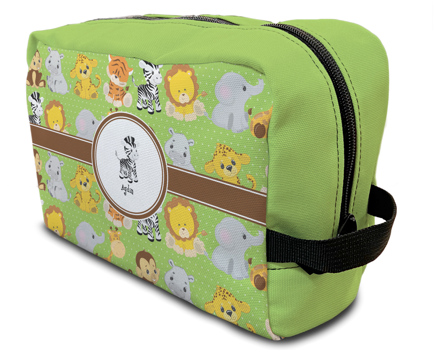 Our toiletry bag has the traditional dopp kit design i.e. a side to side zippered closure, giving you easy access to all the contents inside and a sturdy handle on one side of the bag. The canvas fabric for dopp kits is printed, then cut and sewn here in the USA.